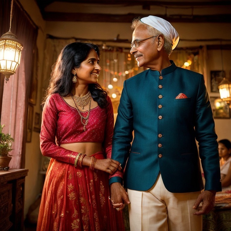 Prompt: "In a vintage haven, an Indian couple, she in a saree, he holding her hand, share a silent, grateful moment amid intricate textiles and warm lamps."