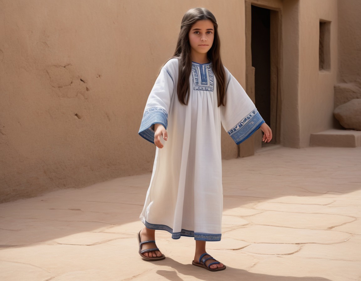 She is dressed in an ankle-length, grey-white tunic with blue embroidery on the hems.