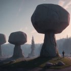 A whimsical landscape featuring three giant, brightly colored mushrooms. In the foreground, a girl in a red dress plays a flute, while a boy strums a guitar nearby, surrounded by nature.