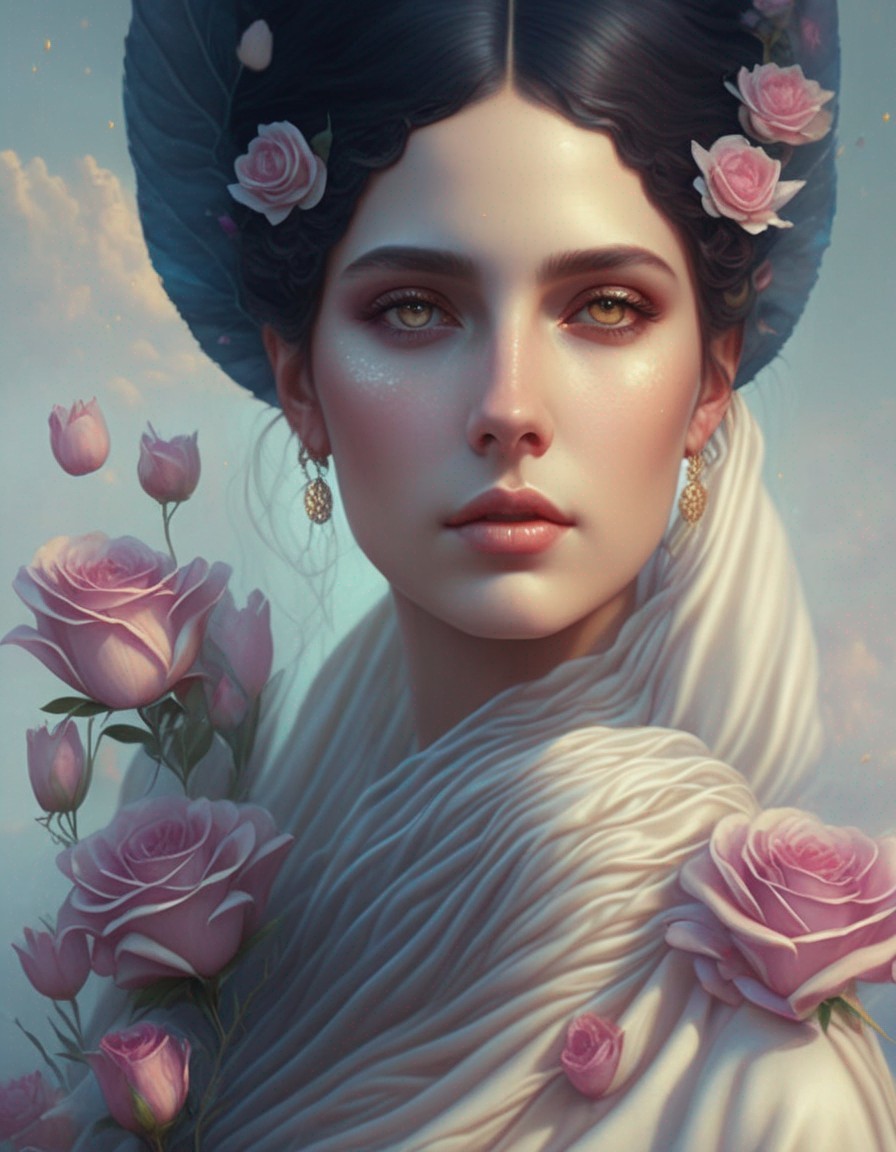 A portrait of a woman with flowers in her hair, intense eyes, surrounded by a veil and ethereal blossoms.