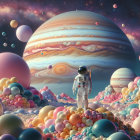 An astronaut stands on a colorful, candy-like landscape, surrounded by giant planets and fluffy clouds. The scene is whimsical, blending space and playful elements in a vibrant cosmos.