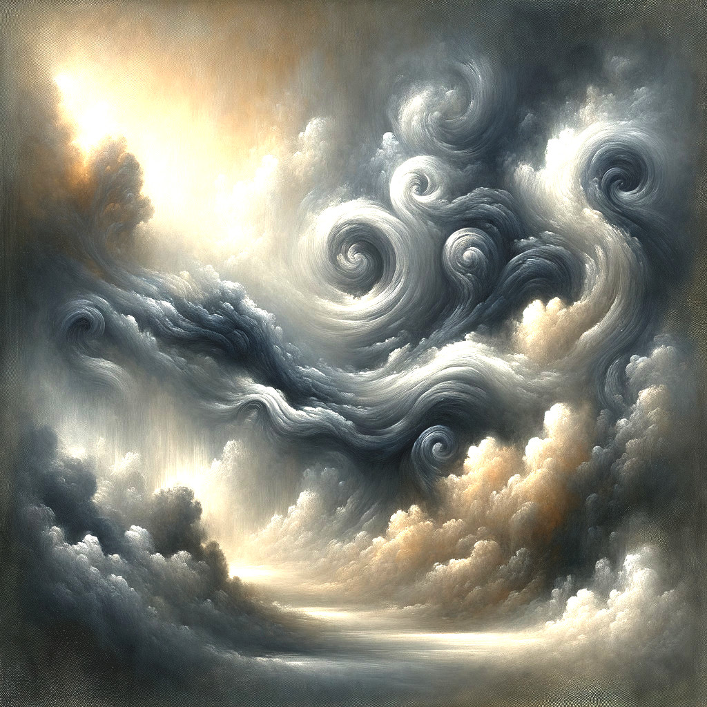 Prompt: "Masterpiece painting, surreal landscape, blend of Redon, Schiele, Leonardo, and El Greco styles, swirling forms, elongated figures, shadowy, smoky, milky mist, sharp contrasts, gradient grey and blue ratio composition, ultra-realistic oil painting, dramatic lighting, grey and blue ratio, rich colors, mystical ambiance, ethereal atmosphere, intricate details, textured brushwork, mysterious shadows, luminous highlights, art gallery-worthy, art history fusion"