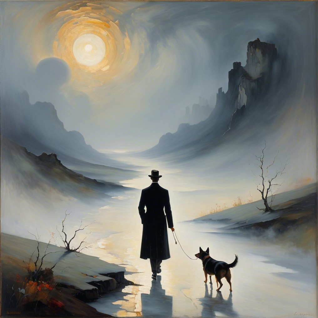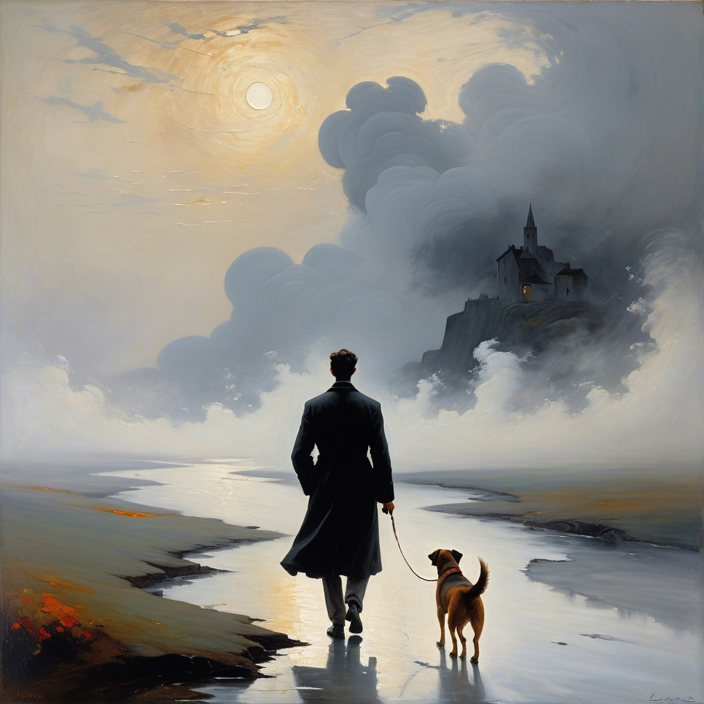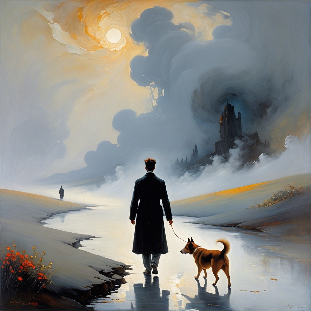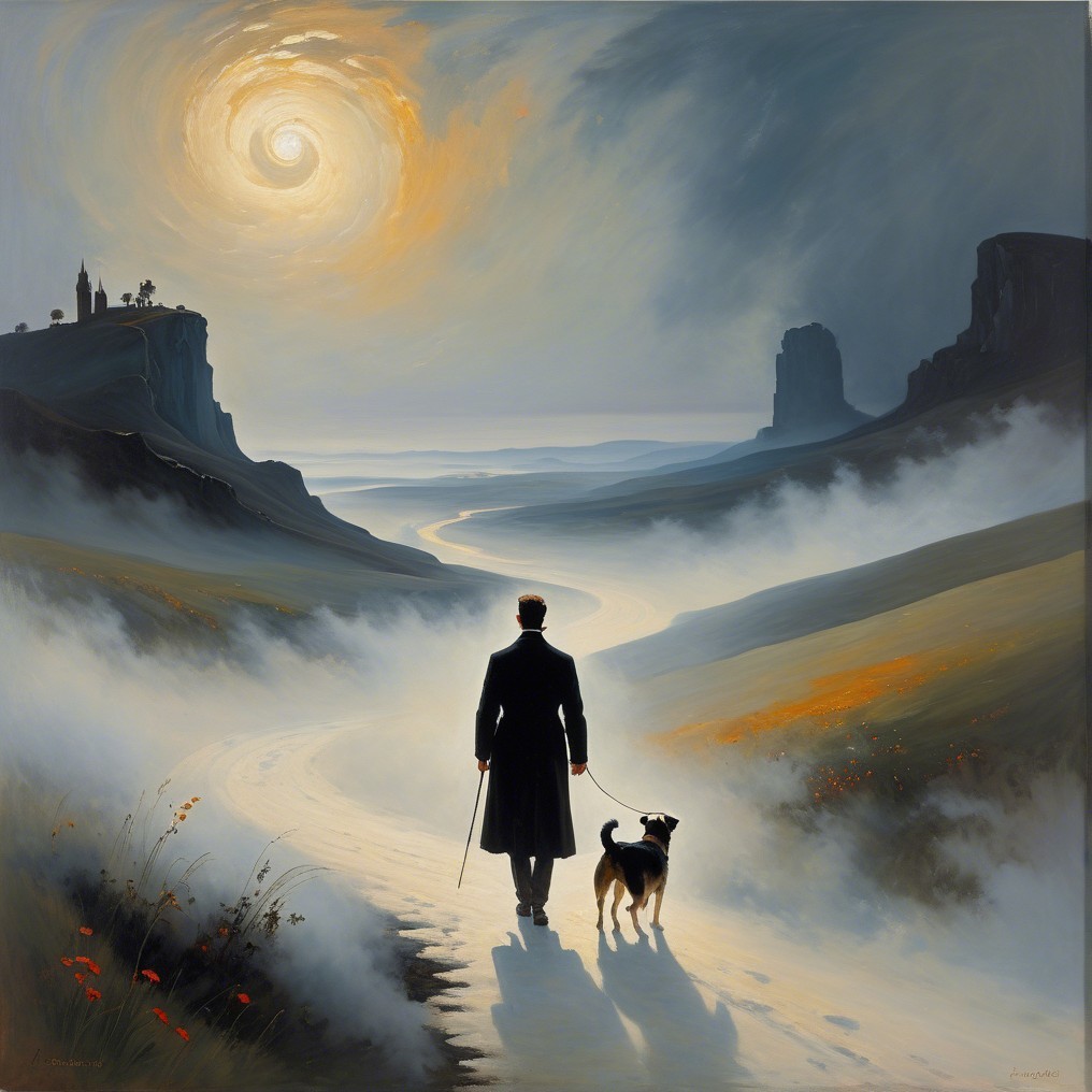 Prompt: Oil on canvas, characterized by thick, heavy swirling paint strokes leading to a textured surface that is cracked, heavy bold paint strokes, milky fog, swirling clouds, art-gallery worthy. An etheral tall elegant figure in the distance, walking thru the fog, seen from behind,followed by a small dog, masterpiece painting, surreal landscape, blend of Redon, Schiele, Leonardo, and El Greco styles, swirling forms, elongated figures, shadowy, smoky, milky mist, sharp contrasts, gradient grey and blue ratio composition, ultra-realistic oil painting, dramatic lighting, grey and blue ratio, rich colors, mystical ambiance, ethereal atmosphere, intricate details, textured brushwork, mysterious shadows, luminous highlights, art gallery-worthy, art history fusion