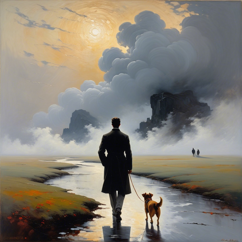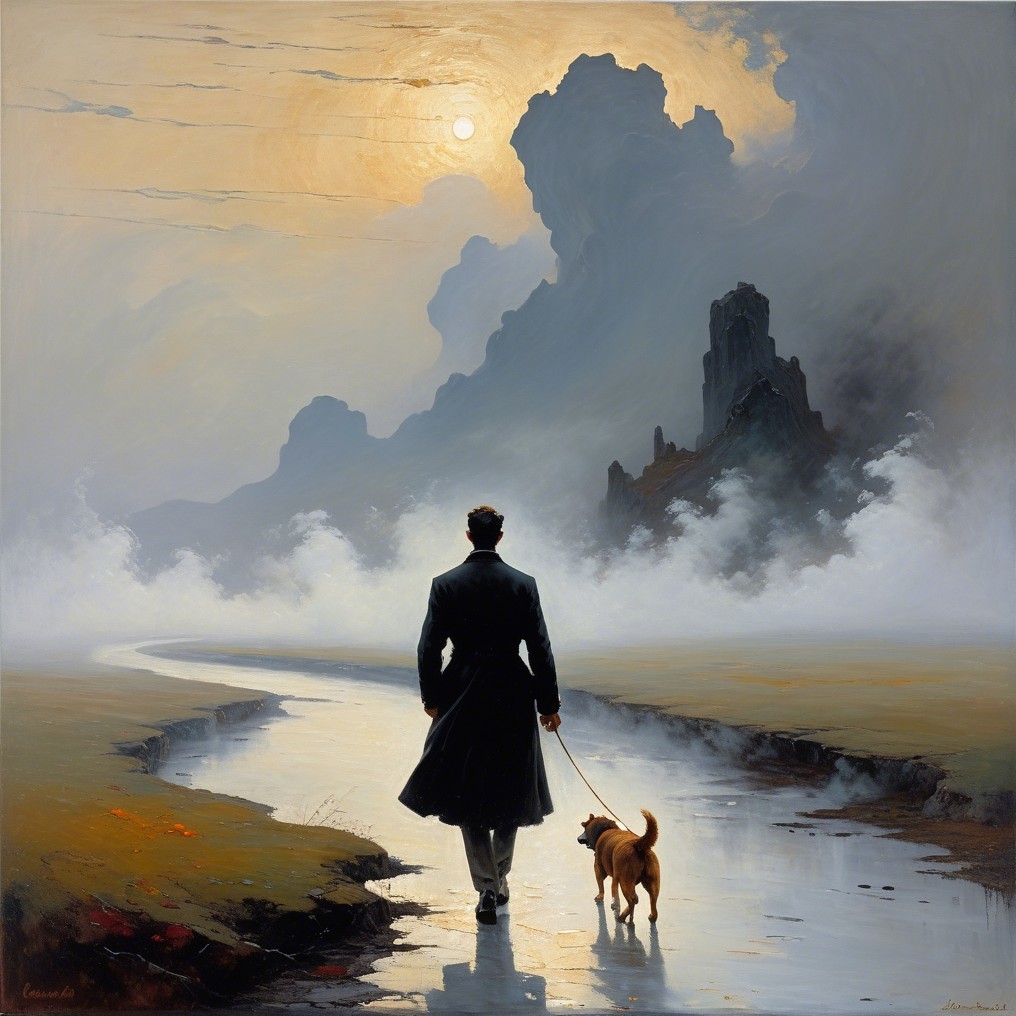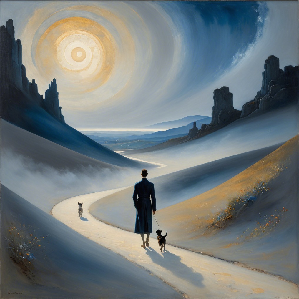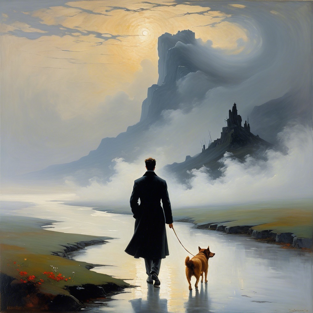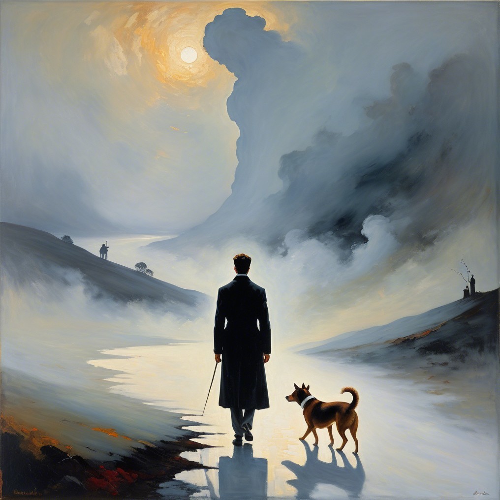 Prompt: Oil on canvas, characterized by thick, heavy swirling paint strokes leading to a textured surface that is cracked, heavy bold paint strokes, milky fog, swirling clouds, art-gallery worthy. An etheral tall elegant figure in the distance, walking thru the fog, seen from behind,followed by a small dog, masterpiece painting, surreal landscape, blend of Redon, Schiele, Leonardo, and El Greco styles, swirling forms, elongated figures, shadowy, smoky, milky mist, sharp contrasts, gradient grey and blue ratio composition, ultra-realistic oil painting, dramatic lighting, grey and blue ratio, rich colors, mystical ambiance, ethereal atmosphere, intricate details, textured brushwork, mysterious shadows, luminous highlights, art gallery-worthy, art history fusion