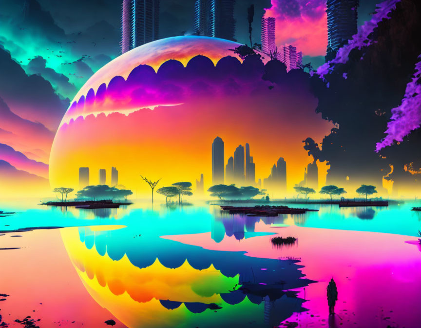 Prompt: "Generate an absolutely insane and surreal scene where the laws of physics and reality are completely twisted. Picture a psychedelic dreamscape with floating islands made of candy, neon-colored rivers flowing with liquid light, and bizarre creatures with mismatched body parts. In the sky, imagine a constellation of floating umbrellas carrying miniature galaxies. The ground is a mosaic of mirrors reflecting impossible landscapes, and the horizon is a blend of cosmic colors that defy earthly norms. Create an image that captures the essence of madness and wonder, where the boundaries of reality and imagination cease to exist"
