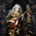 A young woman with flowing blonde hair, adorned with flowers, plays a lute. She's dressed in an intricately designed dark gown, surrounded by golden moons and trees, with a curious cat nearby.