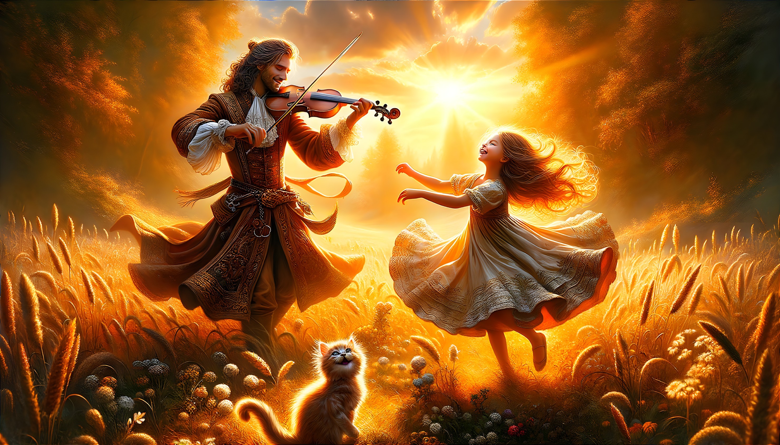 A detailed medieval painting showcases a white violinist serenading a spinning girl in a meadow, with a curious kitten observing. The scene is rich in texture, bathed in warm sunlight, and exudes a harmonious, nostalgic charm. The intricate details, luminous lighting, and dreamy atmosphere create a captivating and hyperrealistic viewing experience