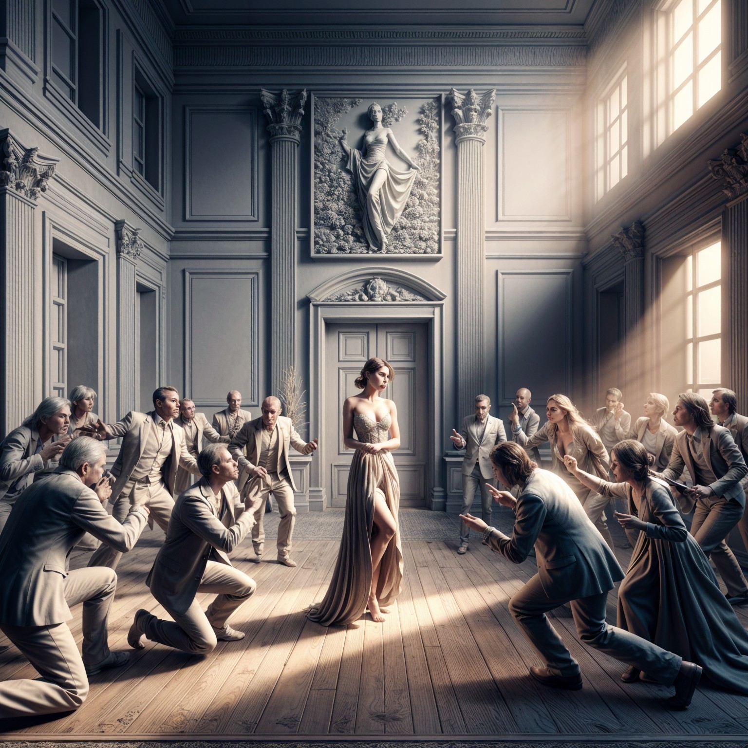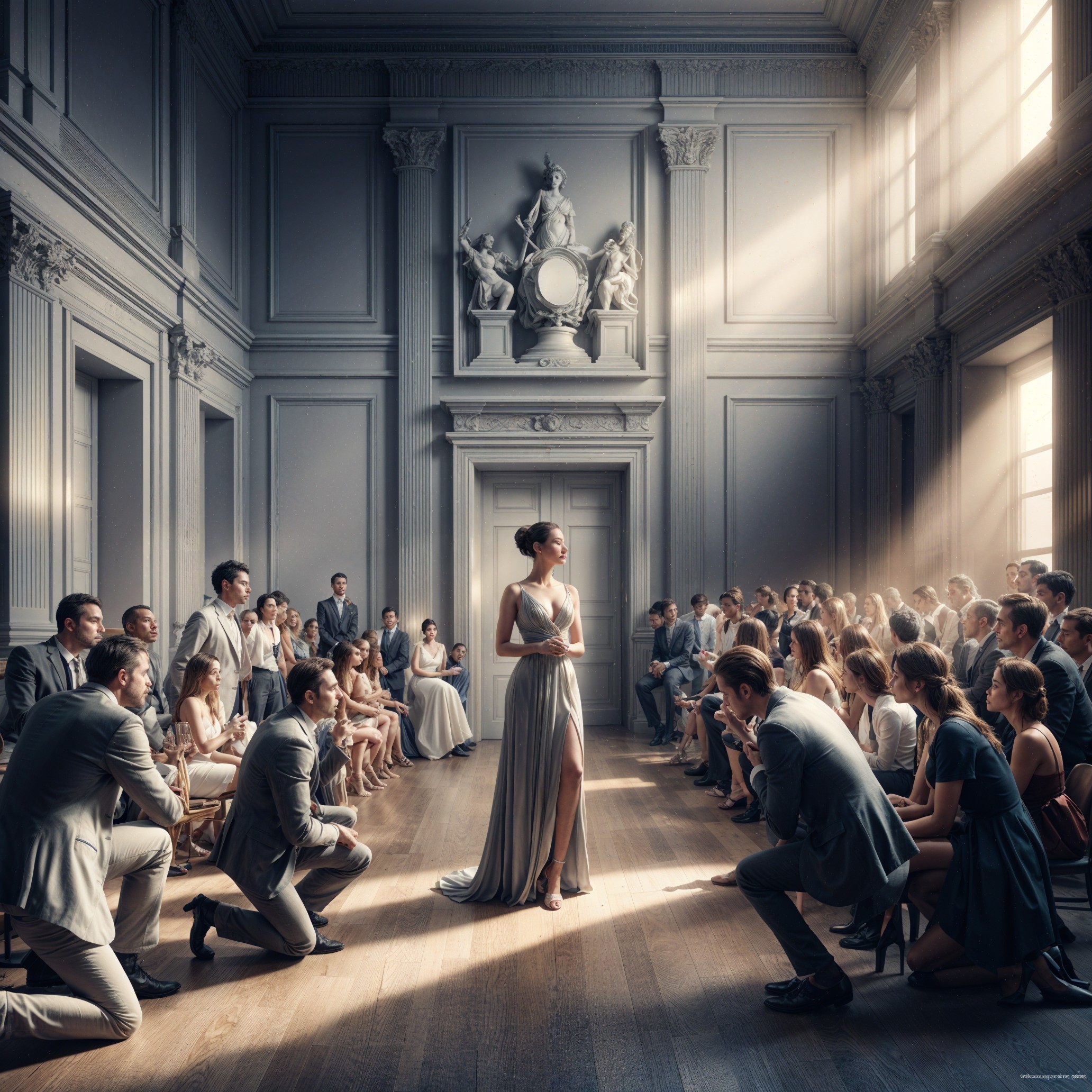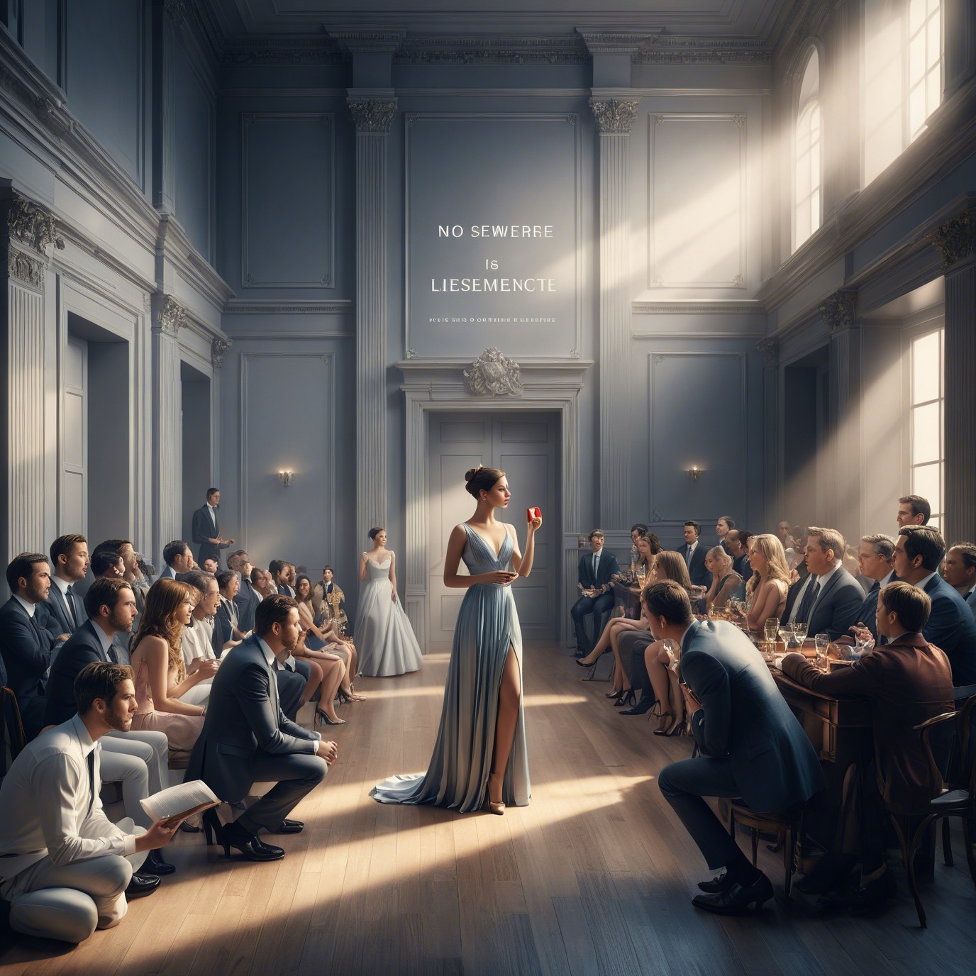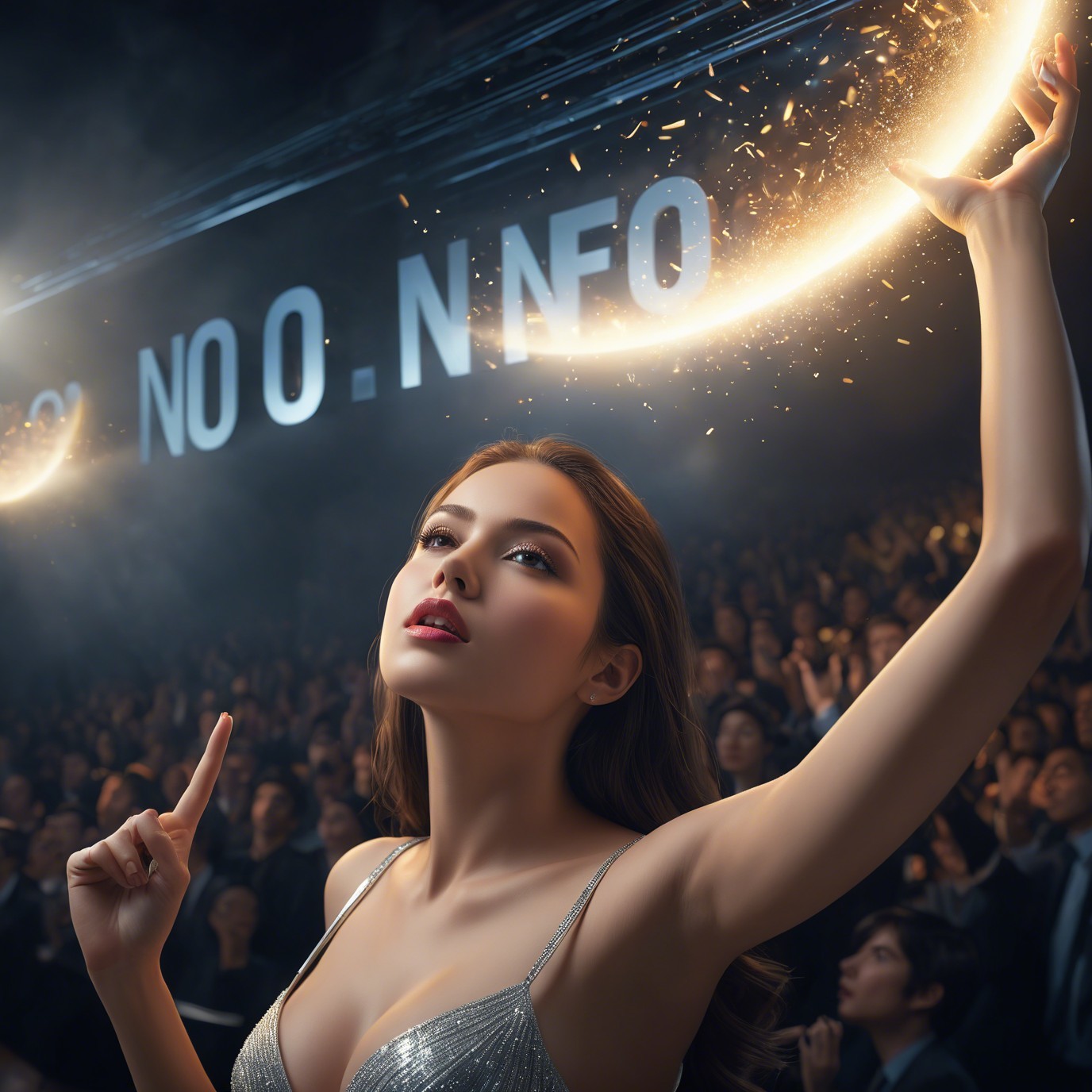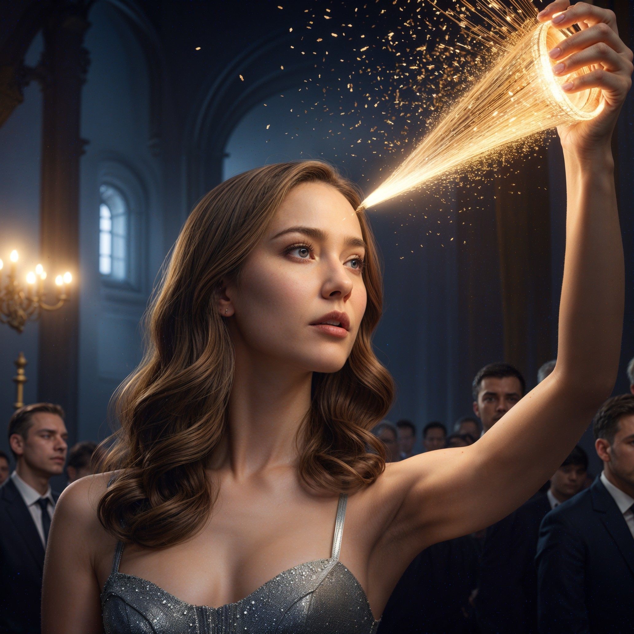 A glamorous woman stands in a dimly lit setting, elegantly dressed in silver, as she projects sparks of light from a glowing orb in her hand, captivating an audience of well-dressed onlookers.