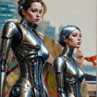Two women in futuristic, mechanical suits stand in a stylized urban setting. Goldfish float around them, blending elements of technology and nature against a dramatic sky. ¯⁠\⁠(⁠°⁠_⁠o⁠)⁠/⁠¯