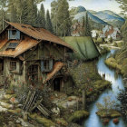 A serene landscape featuring a rustic wooden house by a calm river. Lush trees frame the scene, while a small boat carries people along the tranquil water under a bright, cloudy sky.