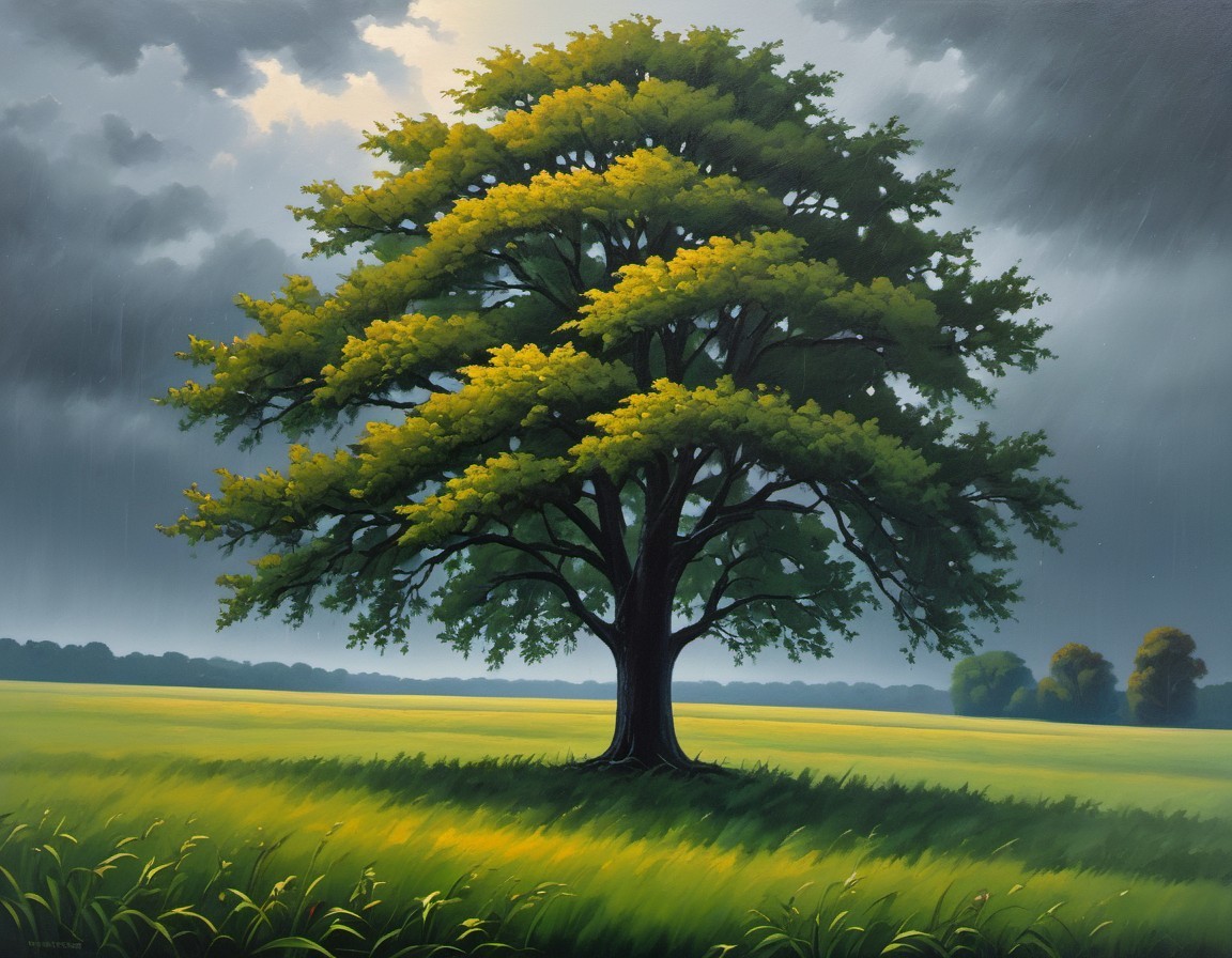 Lush green tree in field under stormy sky with rain and yellow flowers
