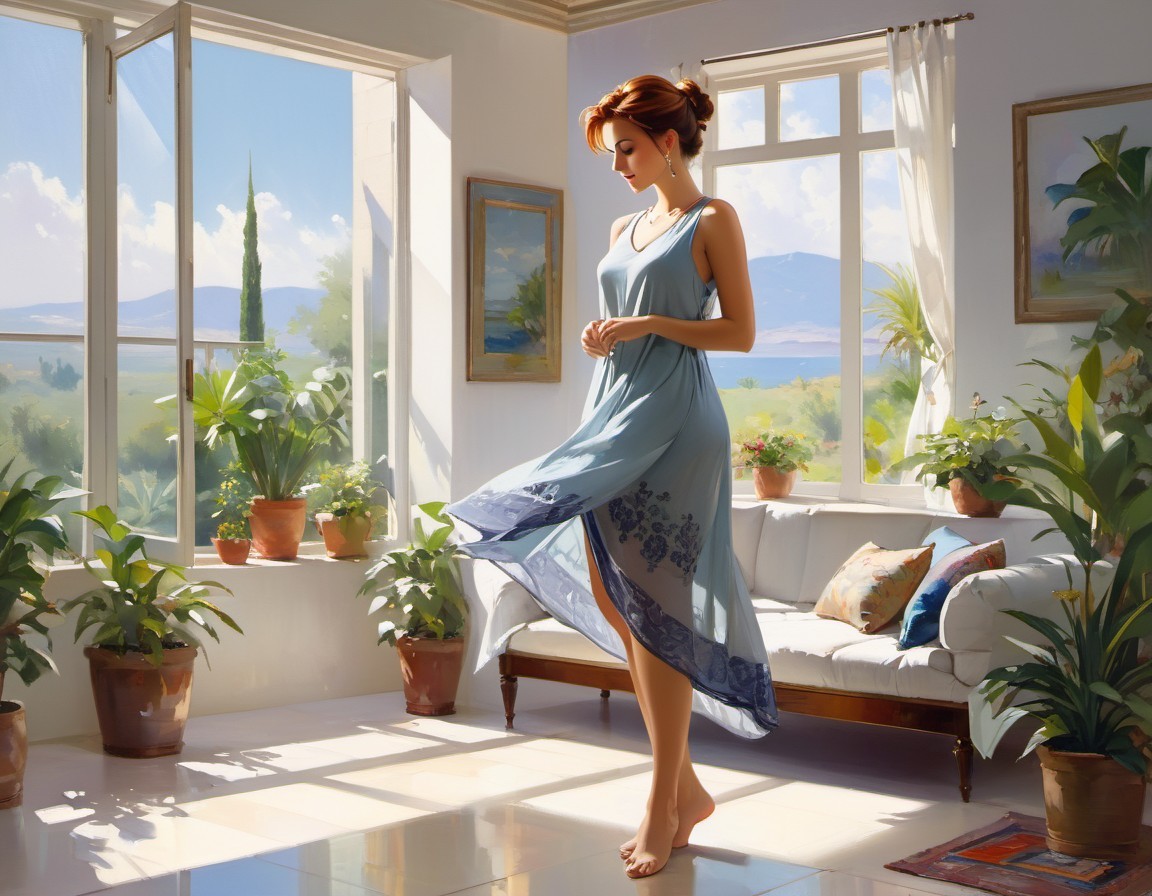 A young woman in a blue dress stands by a sunny window in a room with plants, overlooking a sea view.