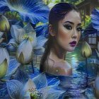A young woman with long, braided hair gazes thoughtfully, surrounded by vibrant blue flowers and lush green leaves. Her soft expression and blue dress blend harmoniously with nature.