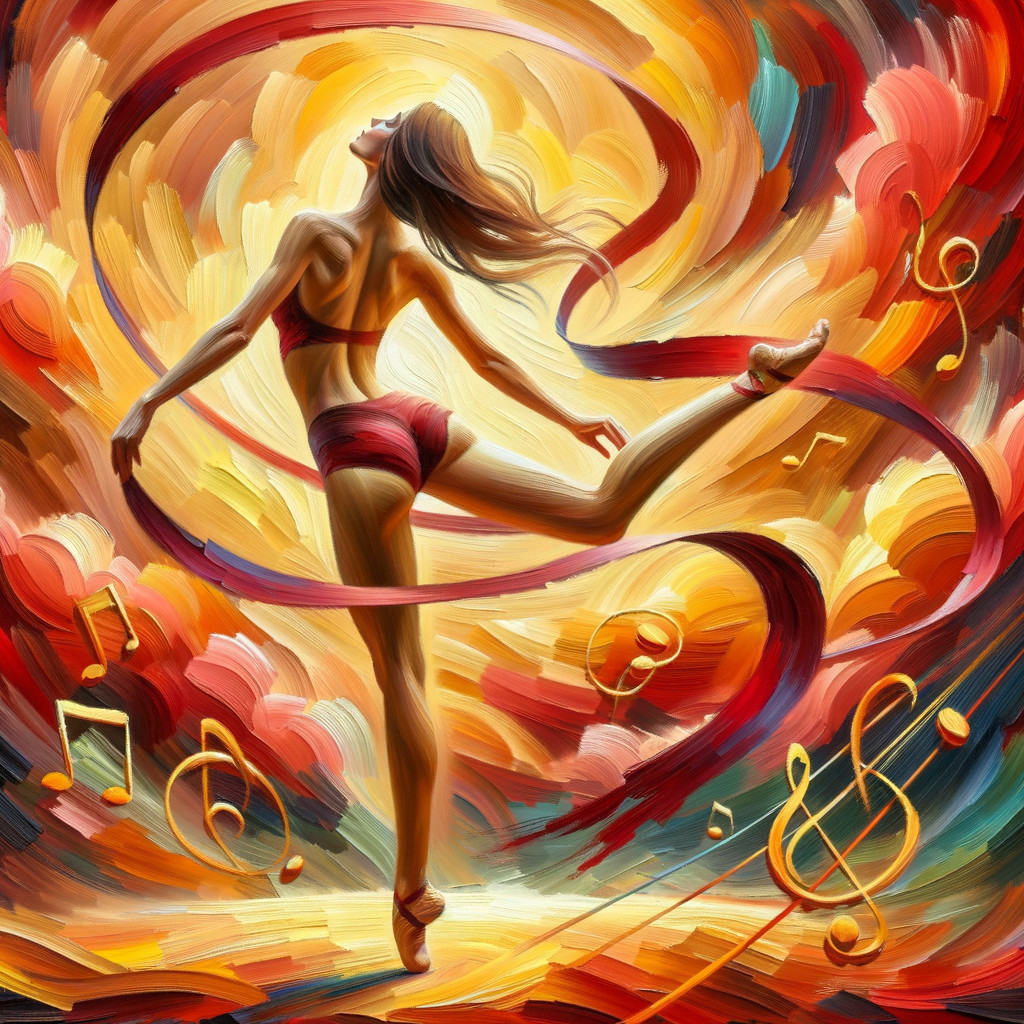 Impasto style, a ribbon dancer twirling her ribbon towards the sky, she dances in a sensual choreography, we see her from behind, her silhouette is superb and feminine. the background is made up of brushstrokes harmonizing carmine red, golden yellow, peach orange vibrations.