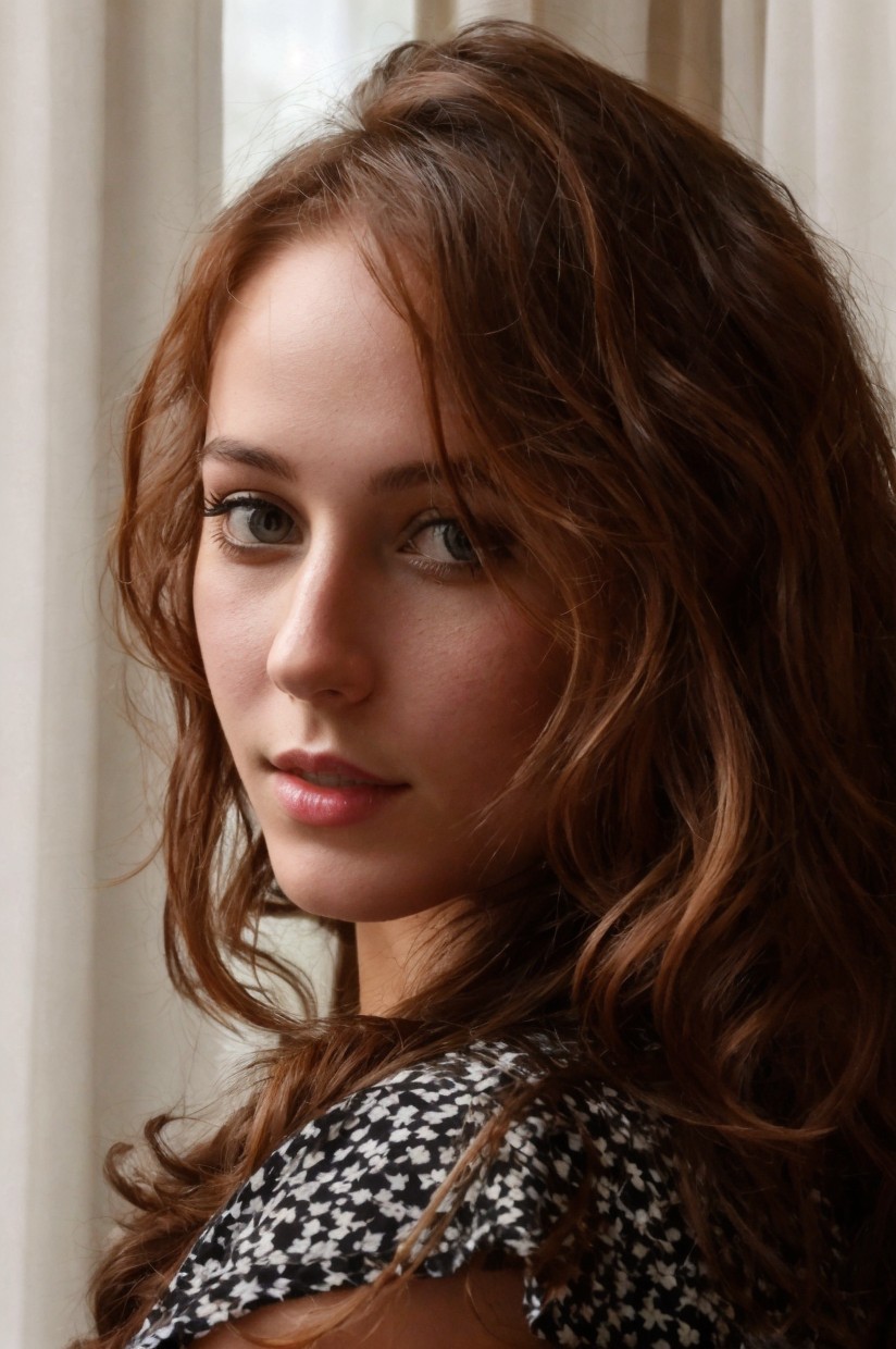 A portrait of a woman with blue eyes, curly brown hair, and a sequined top, set against a blurry background. From my own photo.