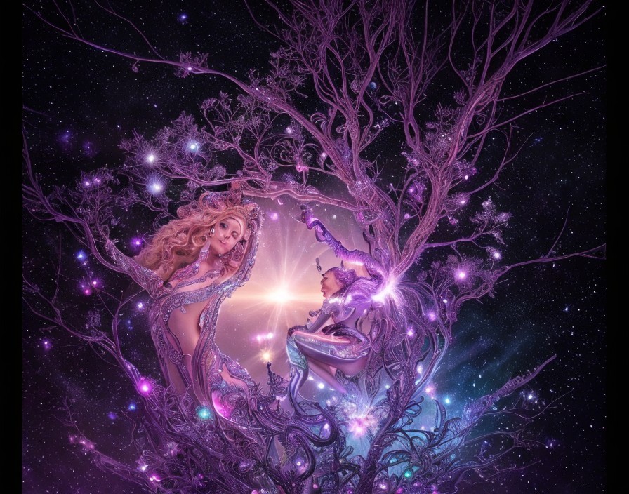 A fantasy image of ethereal women intertwined with a cosmic tree, adorned with stars and celestial bodies, exuding mystical elegance.