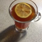 A close-up of a glass filled with amber tea, featuring a lemon slice on top. The glass sits on a reflective surface scattered with ice shards, creating a refreshing ambiance.