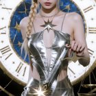 A futuristic figure poses with metallic attire and headphones, set against a cosmic clock backdrop. The striking design features sleek lines and a blend of elegance and edginess.