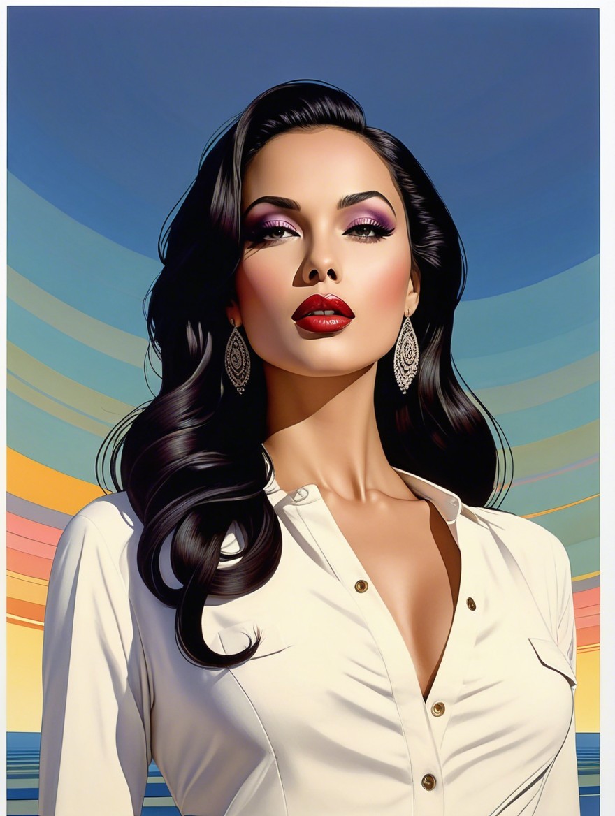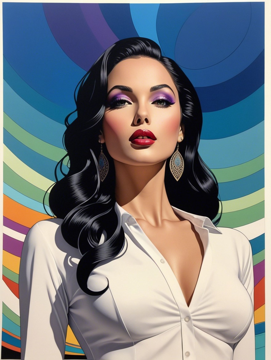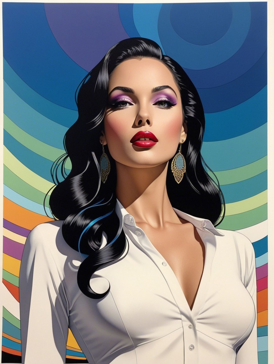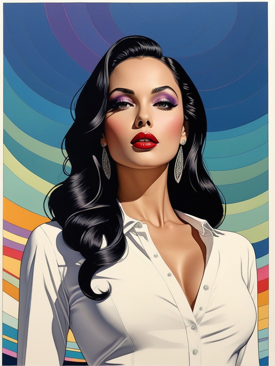 A stylish woman with long, glossy black hair poses confidently, wearing a white shirt. Vibrant, colorful circular patterns form the background, enhancing her bold makeup and glamorous look.
