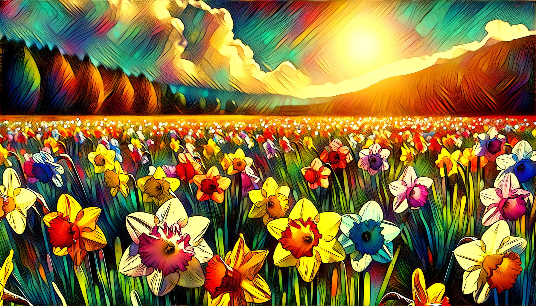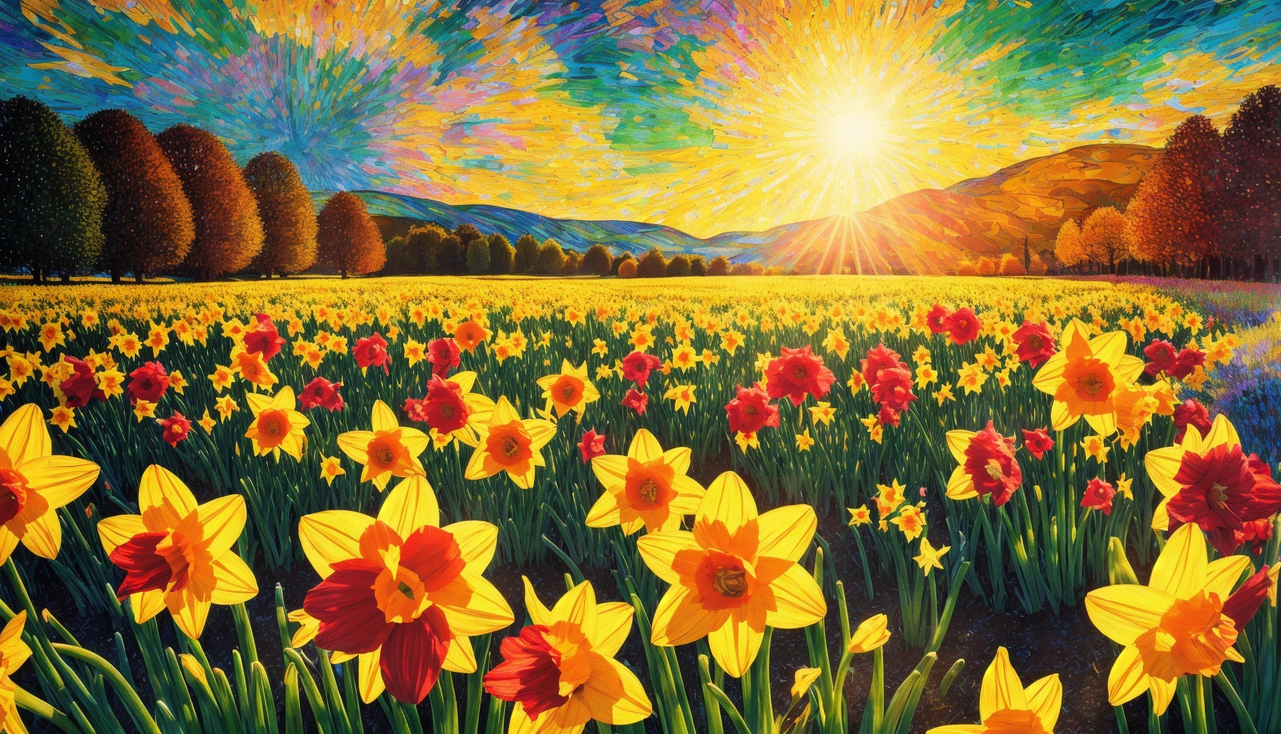 A vibrant, stylized painting of a sunlit field of daffodils with a mosaic-like blue and green sky.