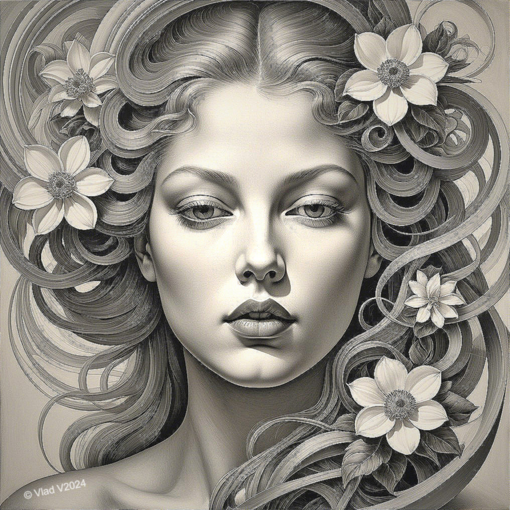 A stunning monochromatic portrait featuring a young woman with flowing hair adorned with flowers. Her serene expression and intricate details create a captivating and enchanting vibe.