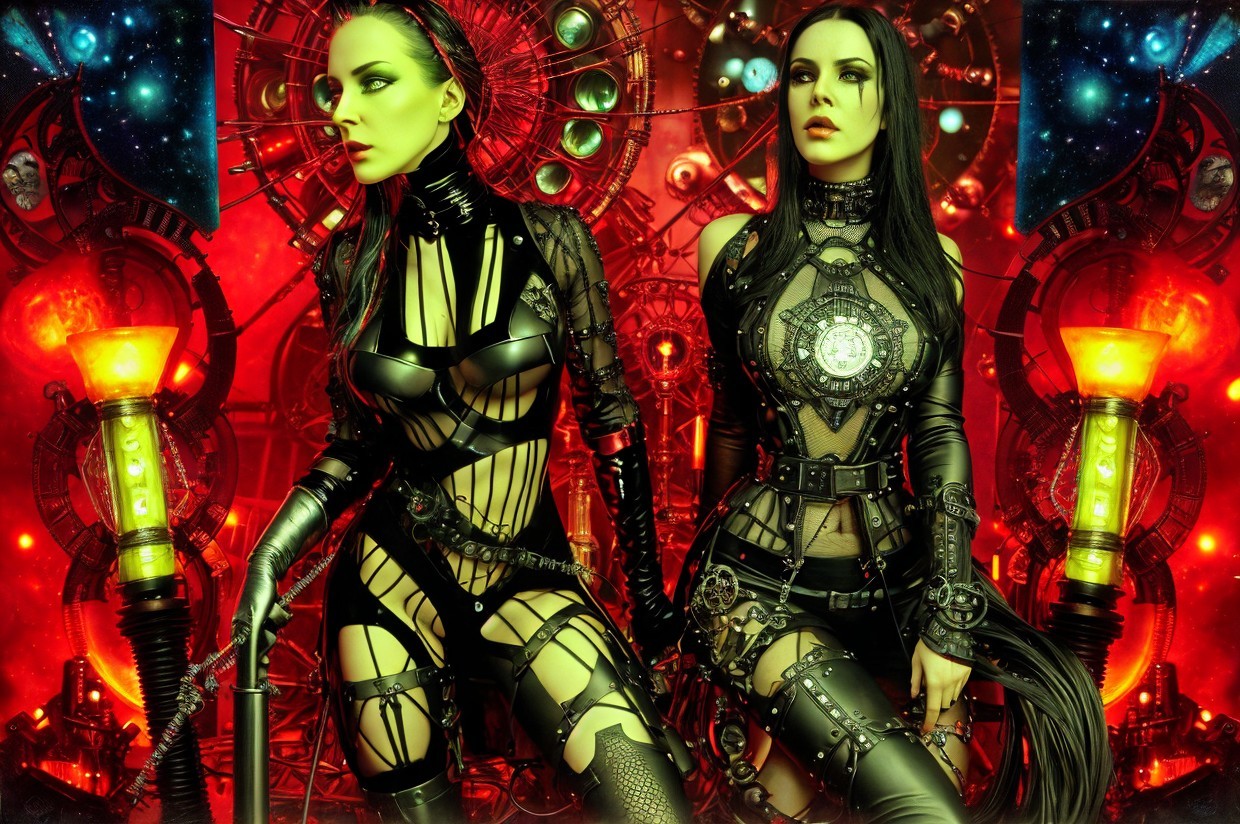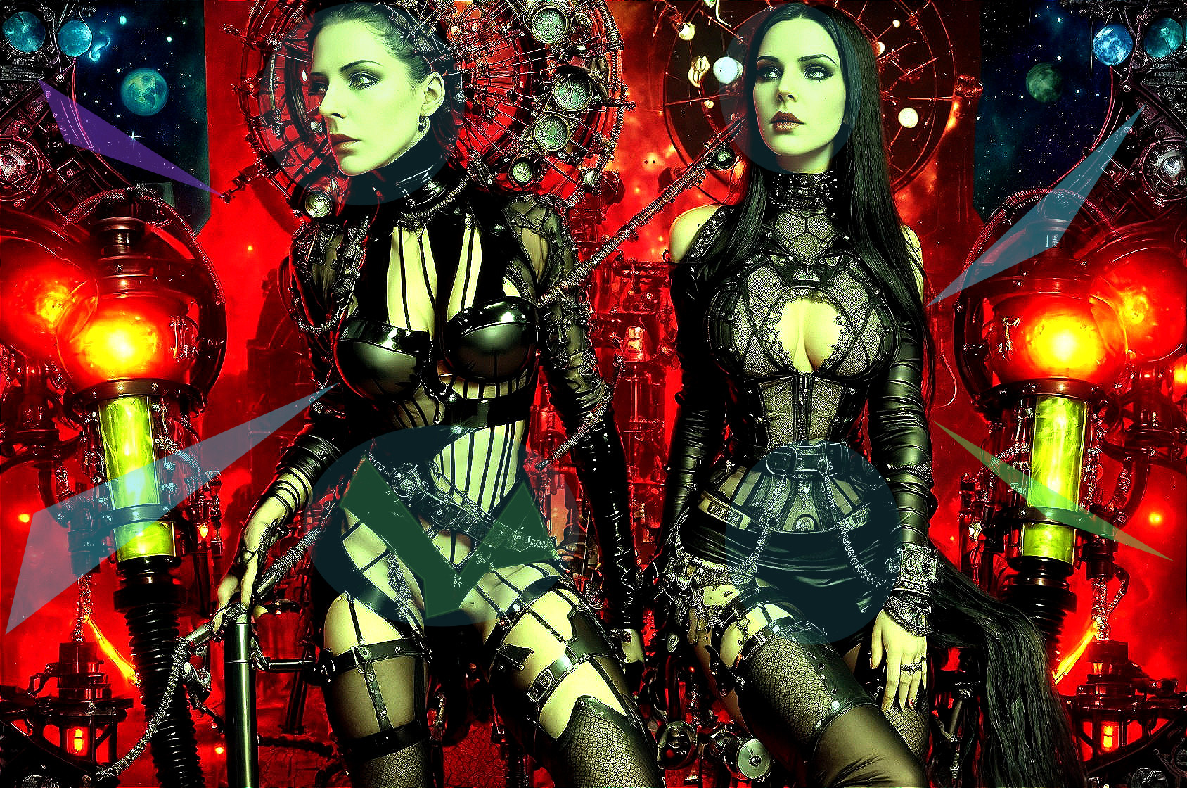 The image features two striking figures in futuristic, edgy outfits with intricate designs. They stand confidently against a vivid red and black background, surrounded by mechanical elements and lights.