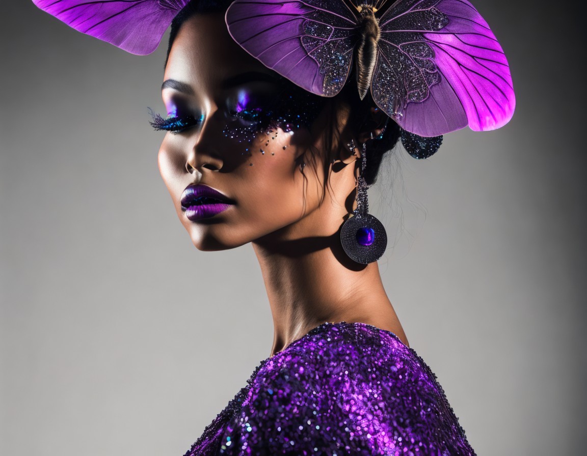 Woman with dramatic makeup, a butterfly headdress, and purple accents, exuding a mystical aura.
