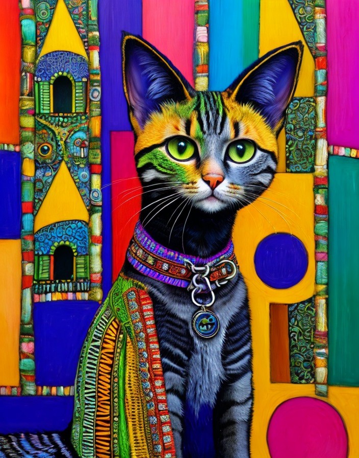 Colorful Cat Painting with Striped Fur and Abstract Background