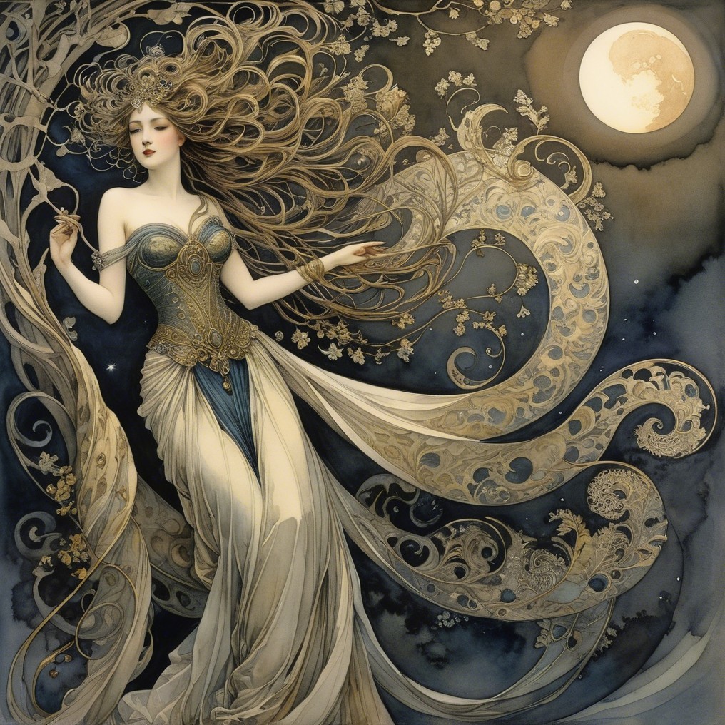 A beautiful, ethereal figure in flowing garments dances gracefully under a glowing moon. Her hair and outfit blend harmoniously with surrounding trees and delicate floral patterns.