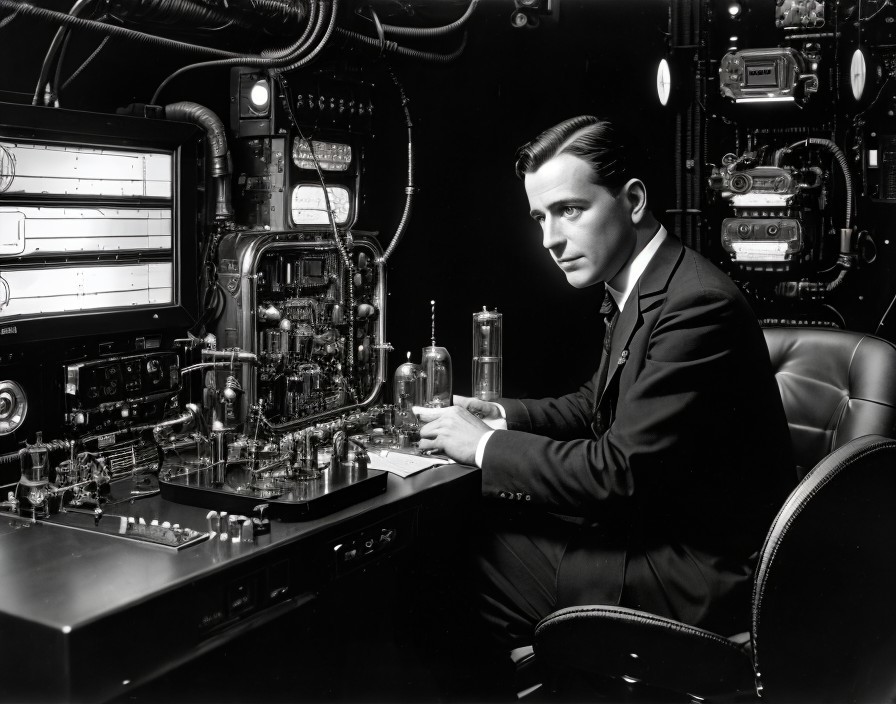 Prompt: "A scene from a 1930 science fiction movie, black and white, daguerreotype, sci-fi, circuit boards, tubes,cables, dirt, an actor in a vintage space suite"
