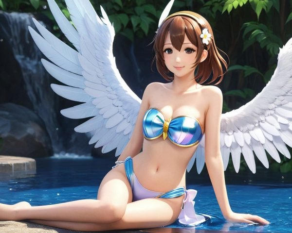 A captivating scene unfolds in a vibrant anime world, featuring a goddess relaxing in a serene sauna, adorned in a stylish swimsuit. The atmosphere is tranquil, radiating warmth and beauty.