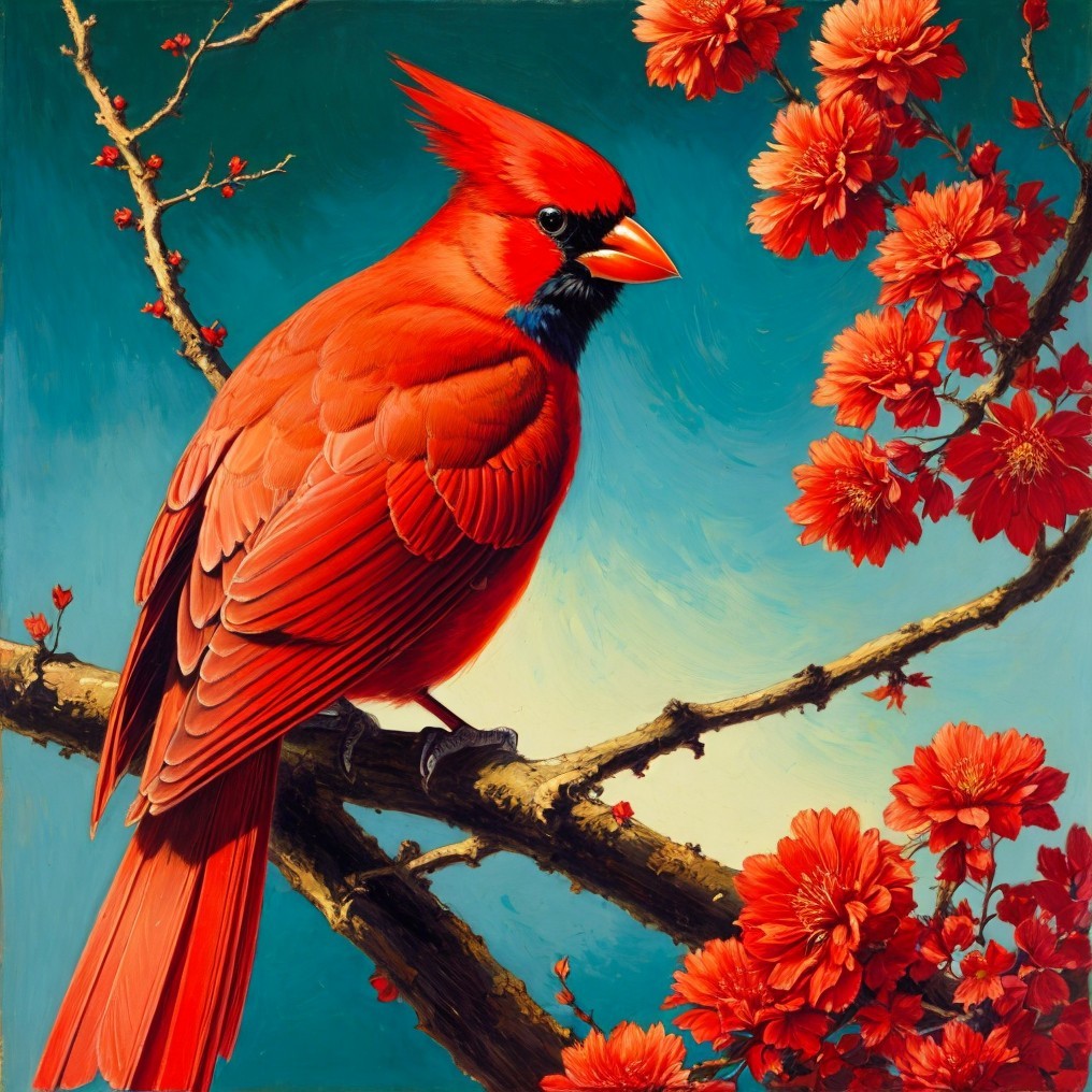 Close-up of a male cardinal. The flowers didn't evolve to blue, but they are probably a better foil to the bird anyway.