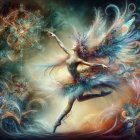 A graceful figure dances amidst swirling colors and flowing water, adorned in a shimmering, nature-inspired costume. The ethereal atmosphere creates a dynamic fusion of movement and light.