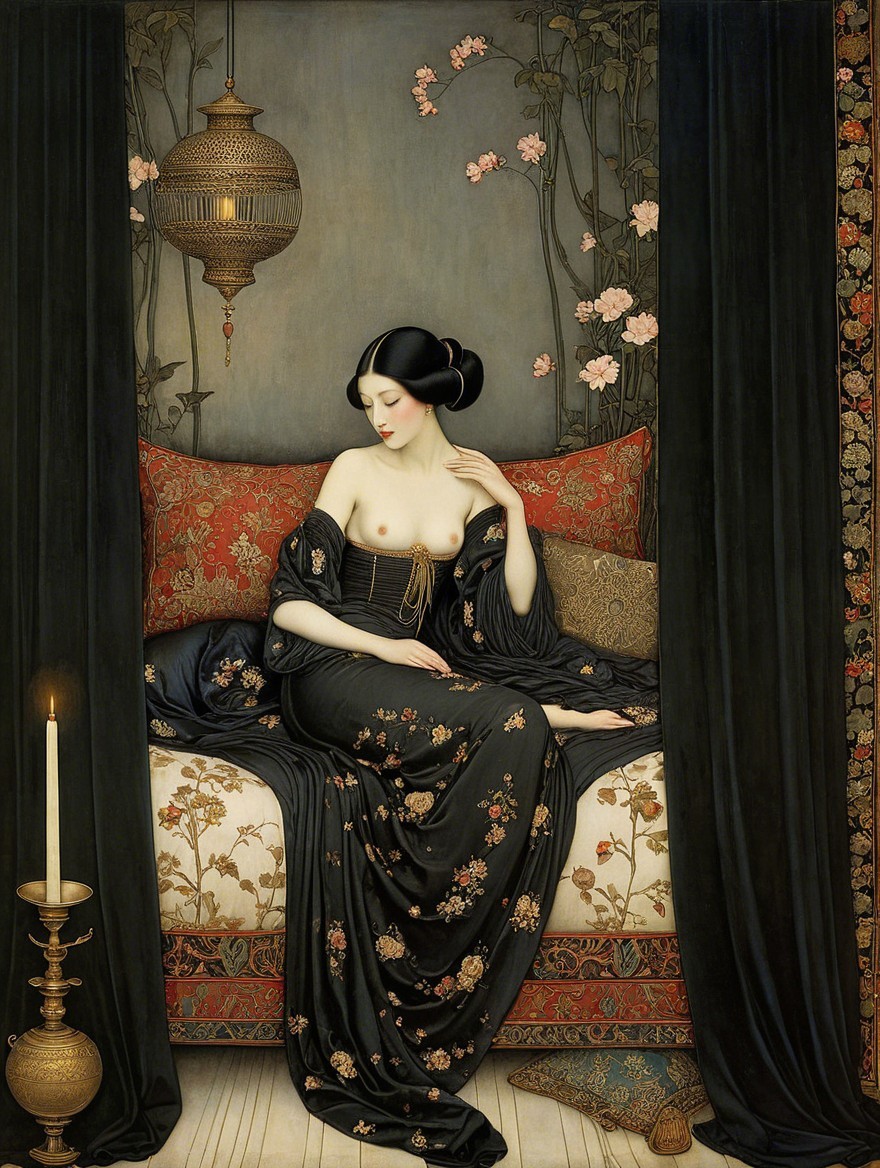A graceful woman in an elegant gown lounges on a richly adorned bed, surrounded by opulent decor, soft candlelight, and intricate designs, evoking a serene and luxurious atmosphere.
