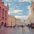 A man with a suitcase walks confidently through a bustling, picturesque street, surrounded by historic buildings and people going about their day under a dramatic sky.