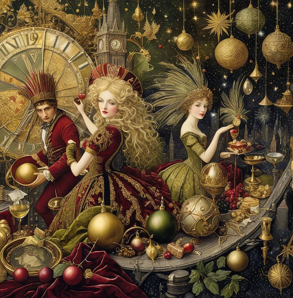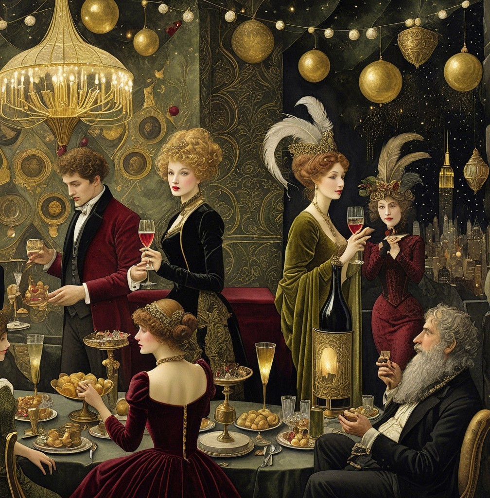 New York vintage New Year’s Eve fantasy party,, 3rd century European miniature art. Velvet Black, Shabby, Dull Gold, olive green, burgundy, Golden Ratio, Surreal Fantasy, Elegant, High Definition Ultra Fine 3D Line, Zenangle Style, Watercolor Patchwork , Arthur Rackham Style, Paul Kidby, Gediminas Prankevicius, Jacek Jerka, Extremely Detailed, Intricate, Thoughtful, HDR, Fractal, Beautiful, Award Winning, Fantasy Look, Fantasy, Crisp Quality
