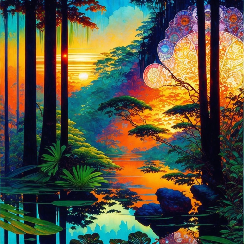 Vibrant Dusk Landscape with Trees and Calm Lake