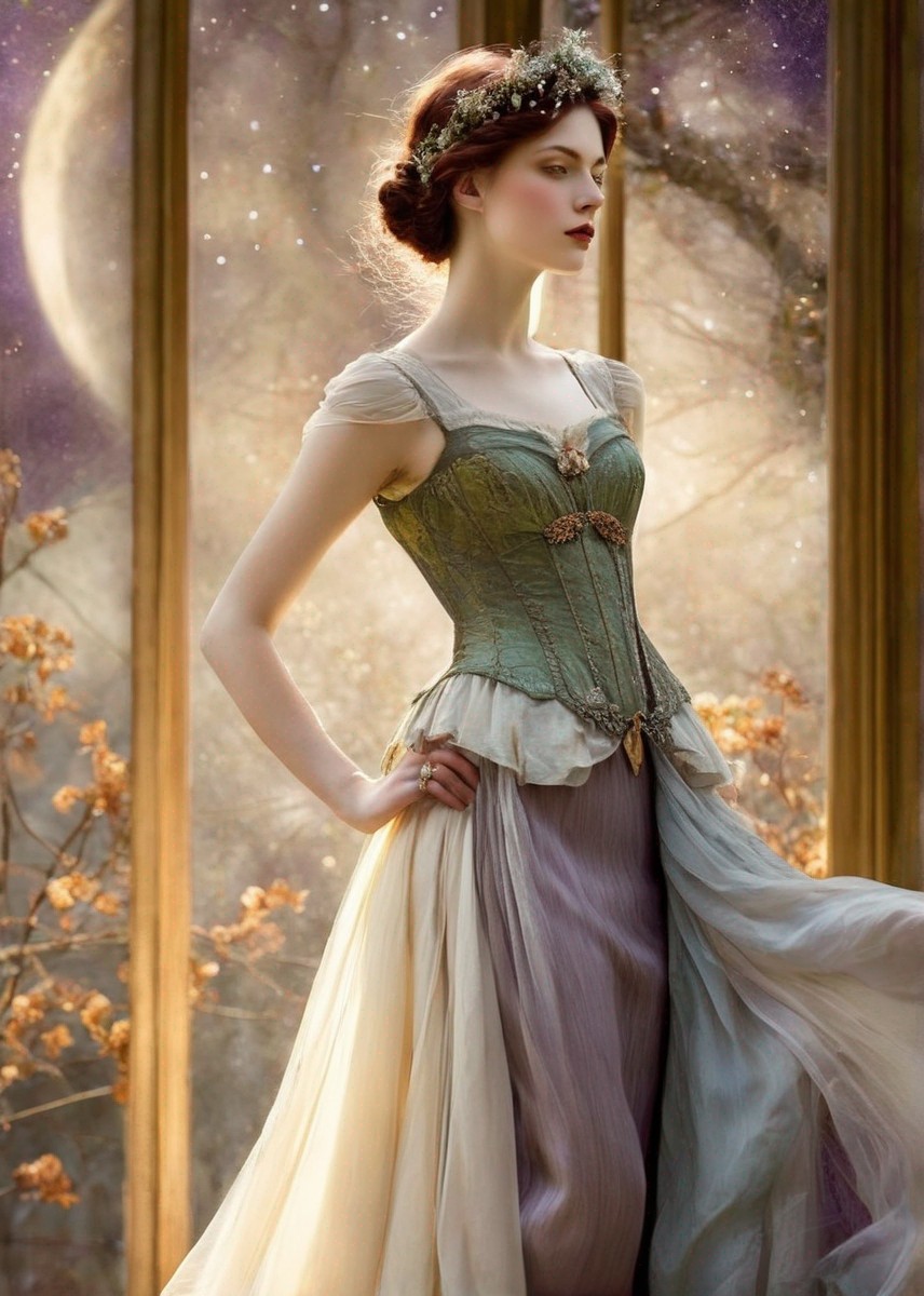 A woman in vintage attire stands before a full moon, framed by barren trees. Her gaze is serene, evoking a timeless elegance.