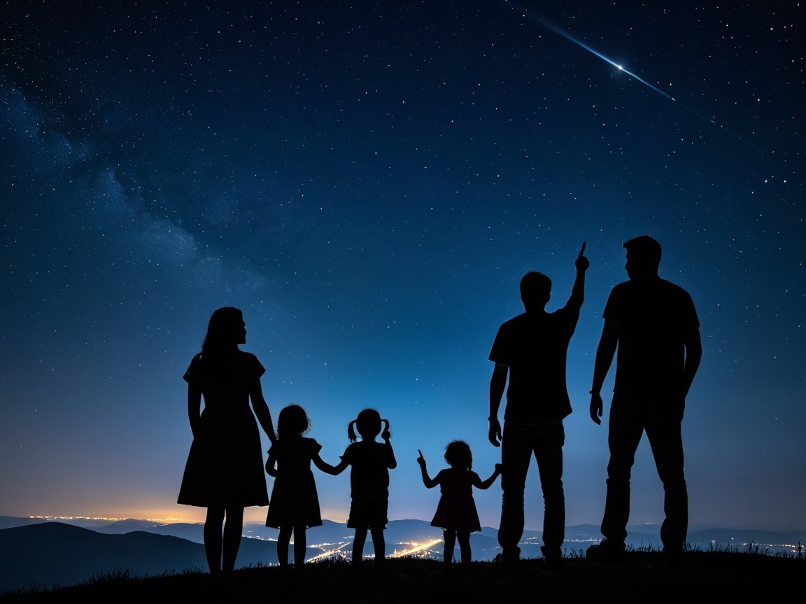 Silhouetted against a starry night, a family enjoys stargazing. One holds a telescope, another points to the sky, while a child curiously reaches out, surrounded by a stunning view of the Milky Way.