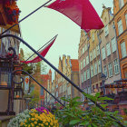 A charming square with colorful buildings adorned with flags, lined with cafes and flower pots bursting with blooms, bathed in warm sunlight creating a welcoming atmosphere.