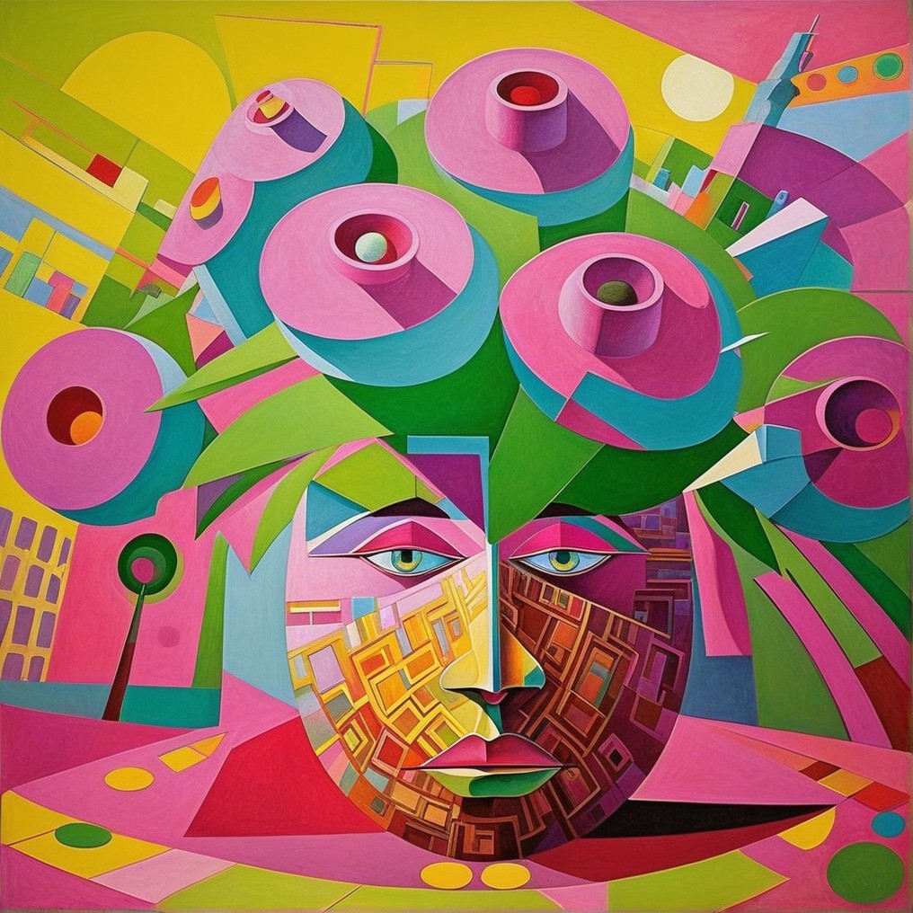 This vibrant artwork features a geometric face with bold colors and patterns. Circular elements and abstract shapes create a lively, energetic atmosphere, blending harmony and expression.