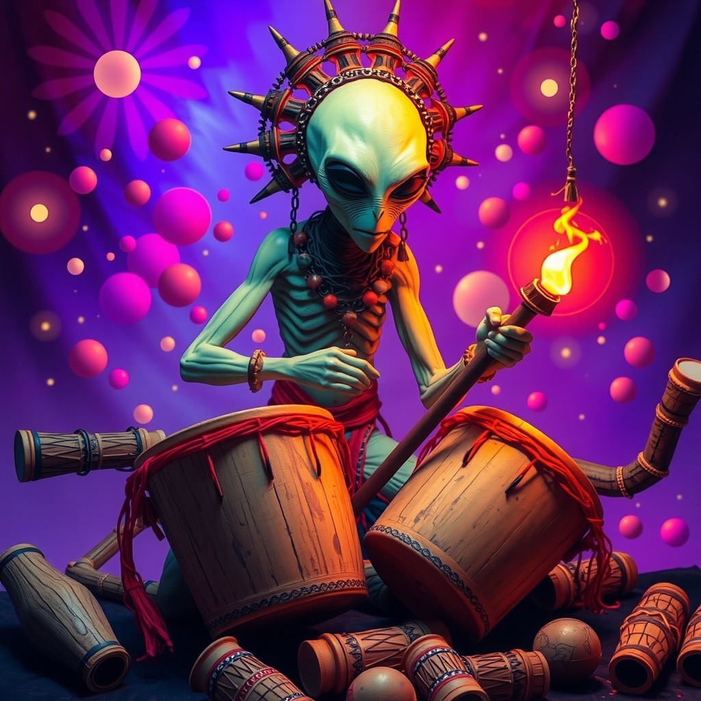 A vibrant alien mesmer plays drums amidst a cosmic backdrop of colorful planets and swirling galaxies, showcasing a fusion of music and cosmic wonder in a whimsical, surreal setting.