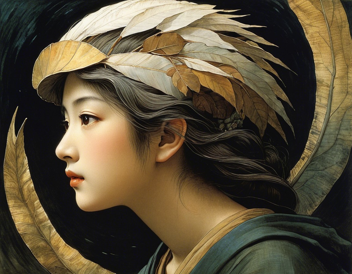 A serene portrait of a young woman with flowing hair and delicate features, adorned with aquatic plants and goldfish swimming around her, evoking a sense of harmony with nature.