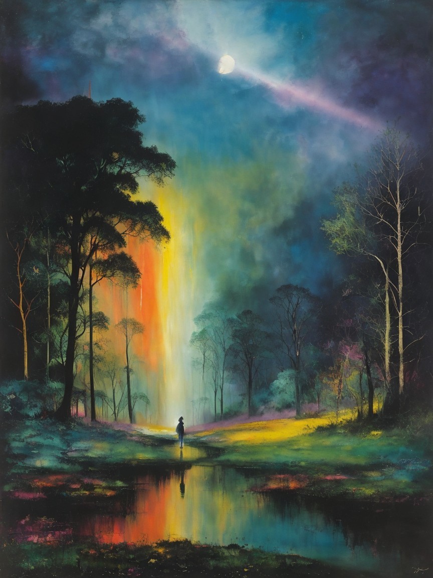 A serene landscape features a person standing by a reflective stream, surrounded by vibrant, colorful foliage and a mystical sky illuminated by moonlight and ethereal colors.