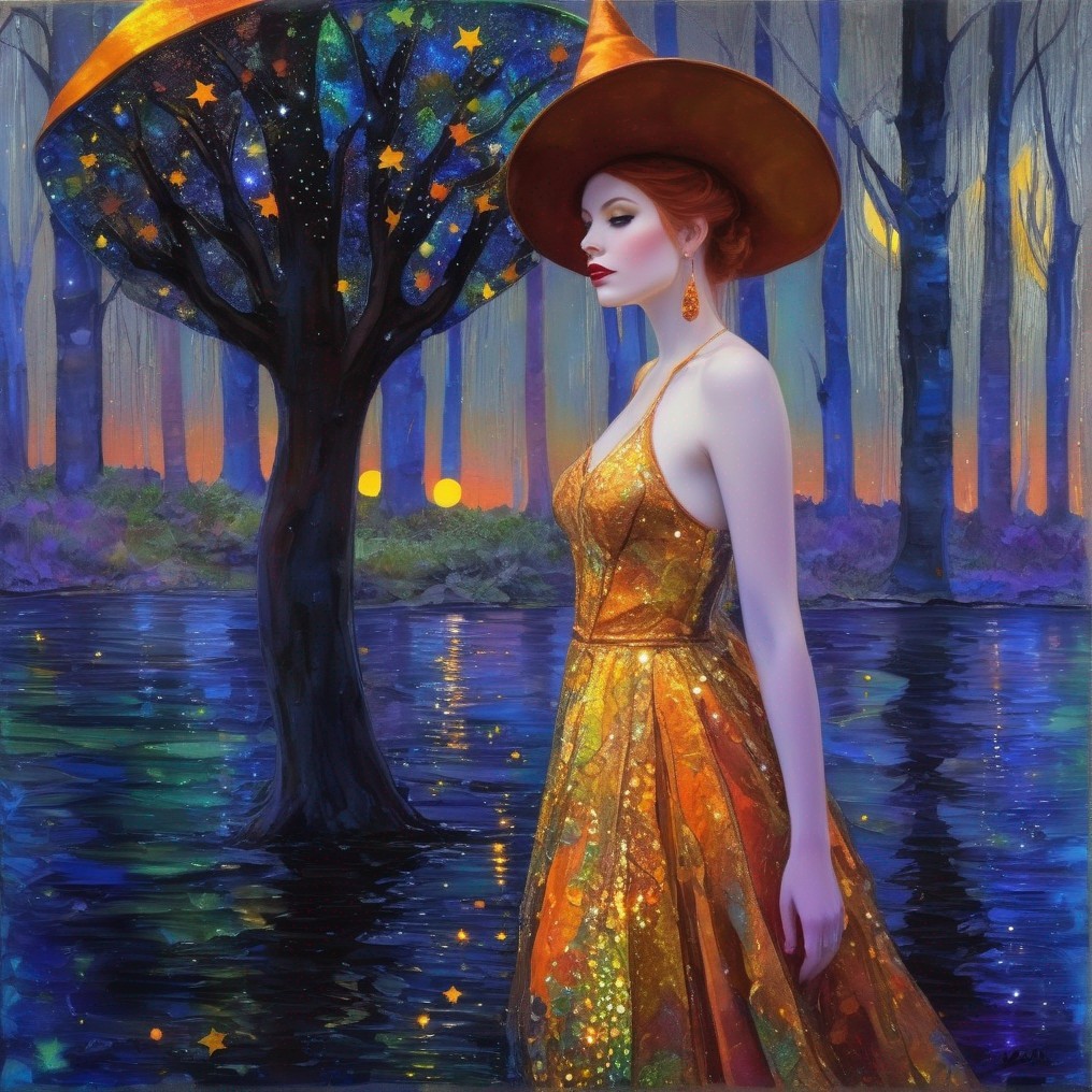 A woman in a starry witch hat and golden gown stands in a magical forest with trees reflecting vibrant purples and blues.