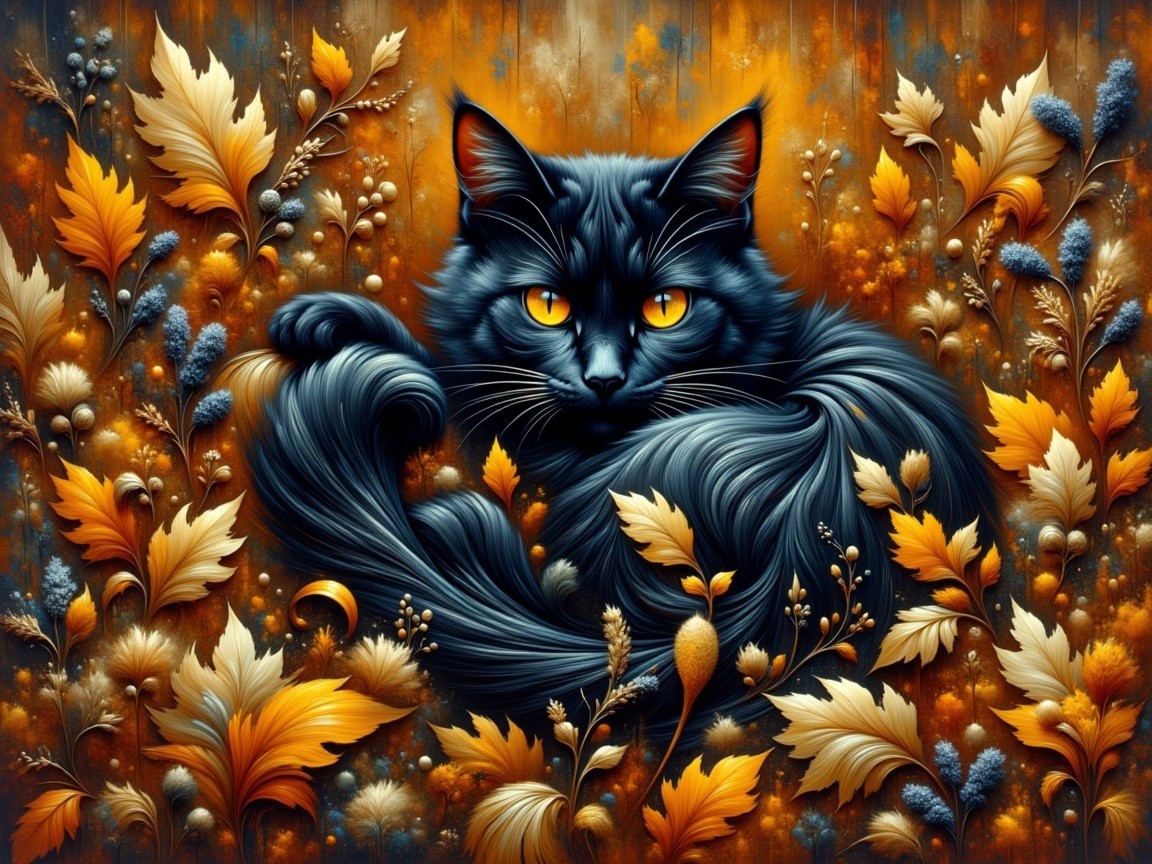 A striking black cat with bright yellow eyes sits amidst vibrant autumn leaves and berries, creating a warm, enchanting scene filled with rich colors and a sense of cozy mystery.