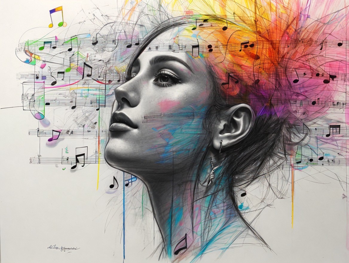 A whimsical portrait of a woman with vibrant, colorful hair blending into musical notes, illustrating a fusion of art and music. The detailed sketch captures emotion and creativity beautifully.