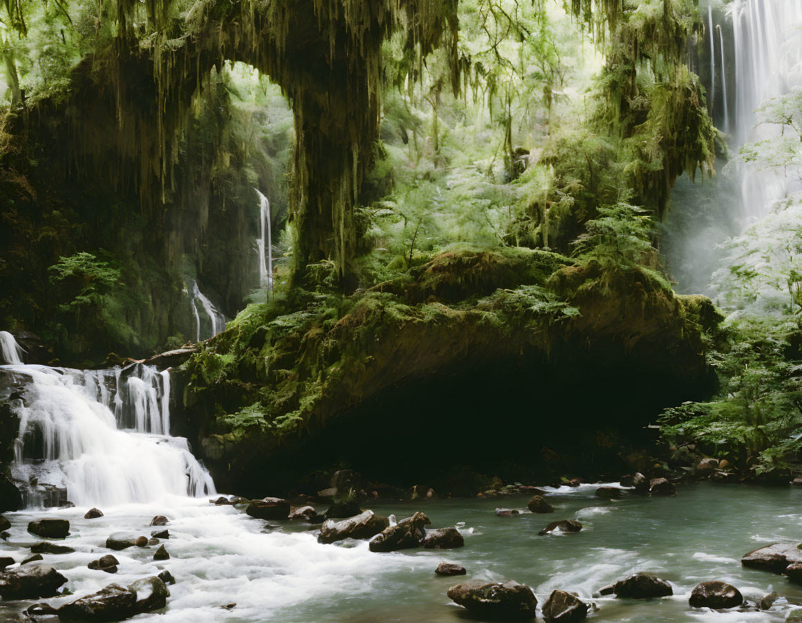 Prompt: "a extremely great crystal PALACE with arches, a stone bridge on top of a cascading WATERFALL, gnarly trees, lush vegetation, a small stream runs beneath the waterfall"