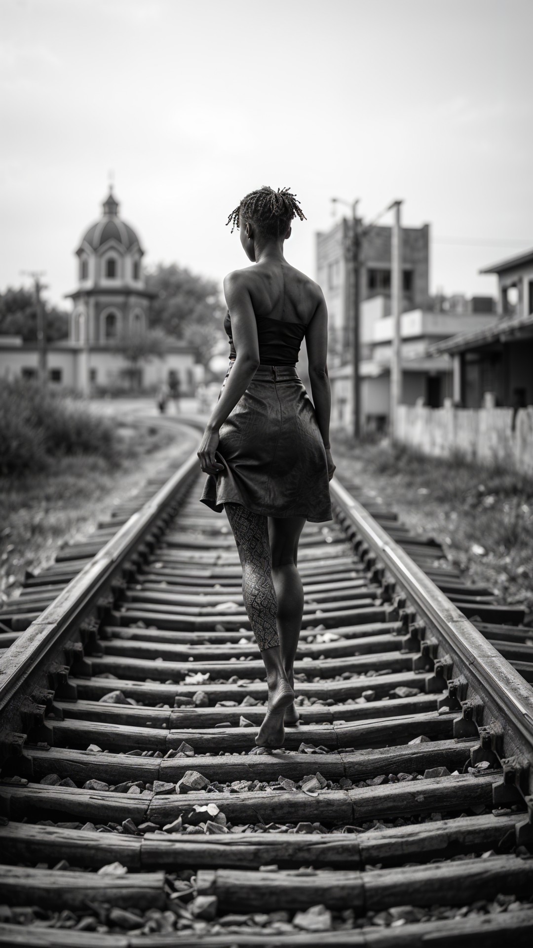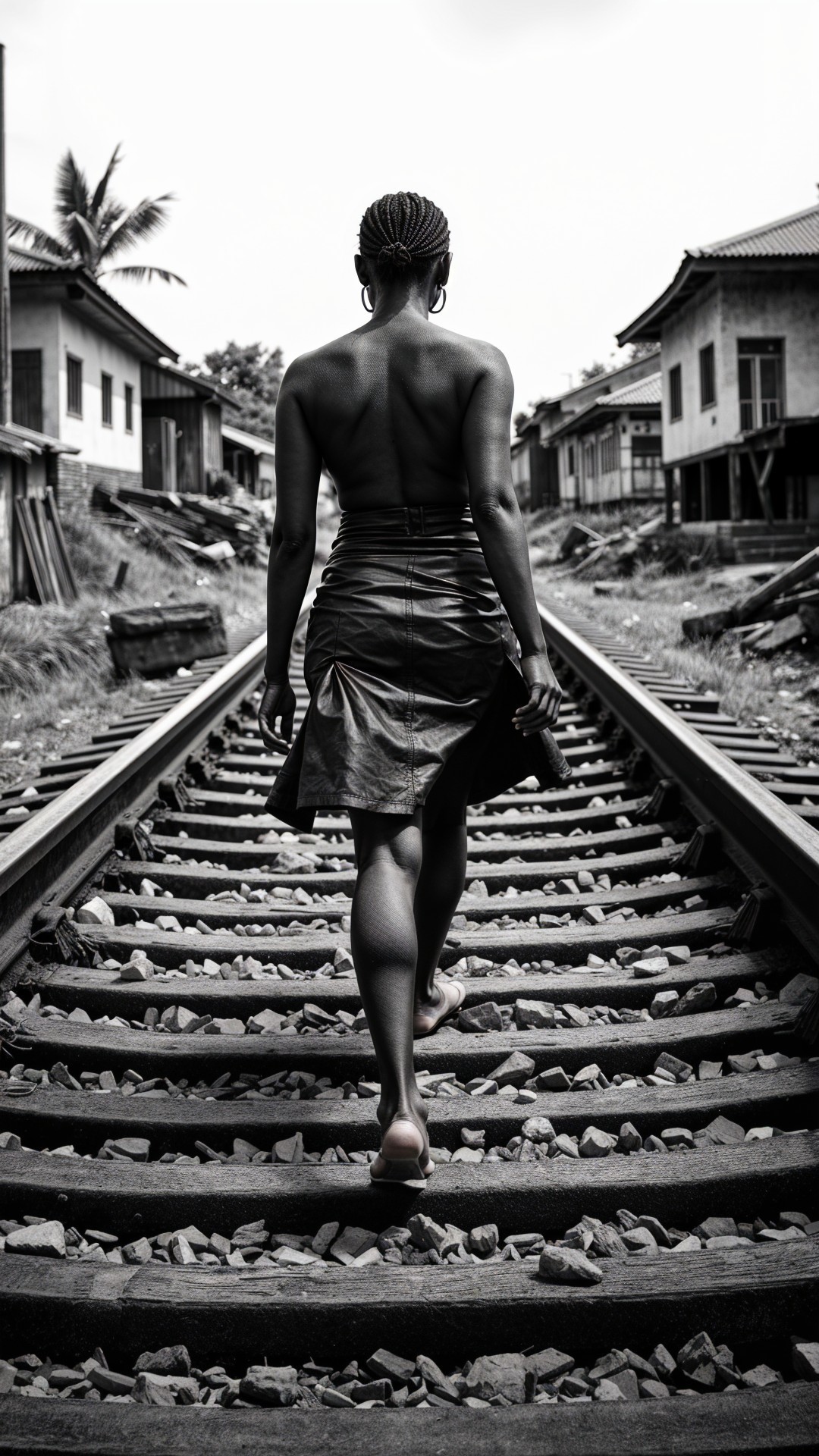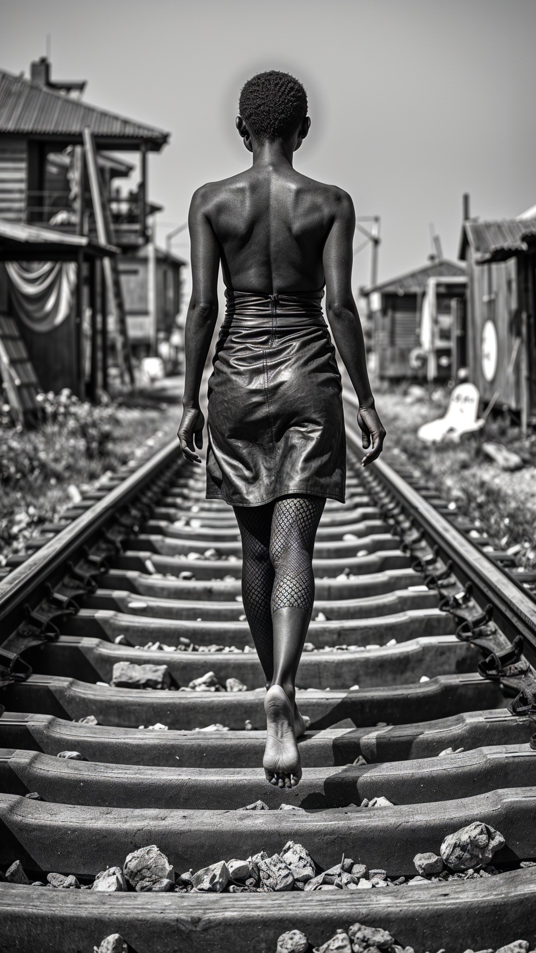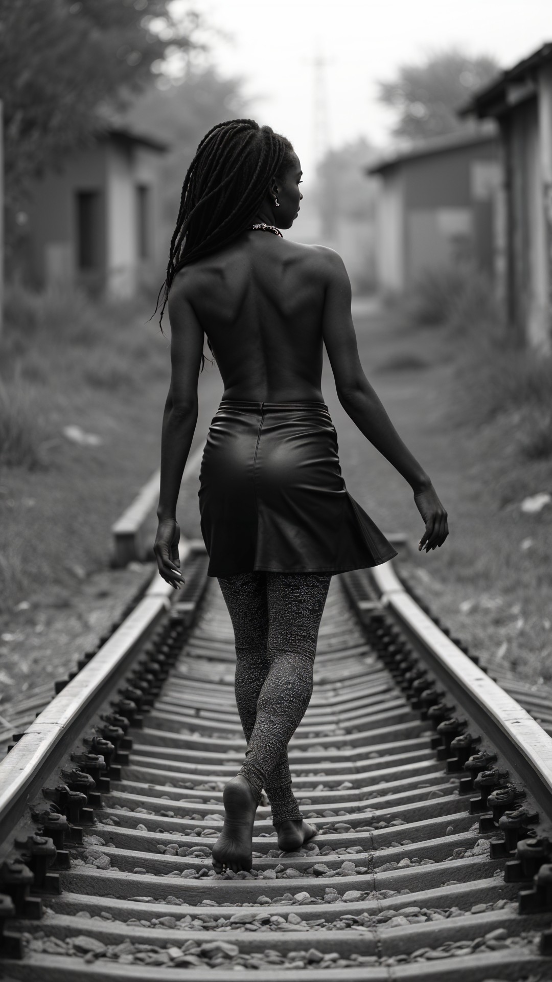 Prompt: "a woman in Ghana, Africa, walking barefoot along a railway track in a black-and-white composition. Her figure is framed from behind, exuding a subtle confidence and sensuality as she strides with purpose. The leather skirt and patterned tights contrast with the natural setting, blending urban sophistication with raw, grounded energy. The worn railway and surrounding rural structures suggest a journey through contrasting worlds, symbolizing resilience and independence. The monochrome palette adds a timeless, evocative quality, highlighting her silhouette and the interplay between movement, texture, and setting. A contemplative narrative of strength and allure unfolds."