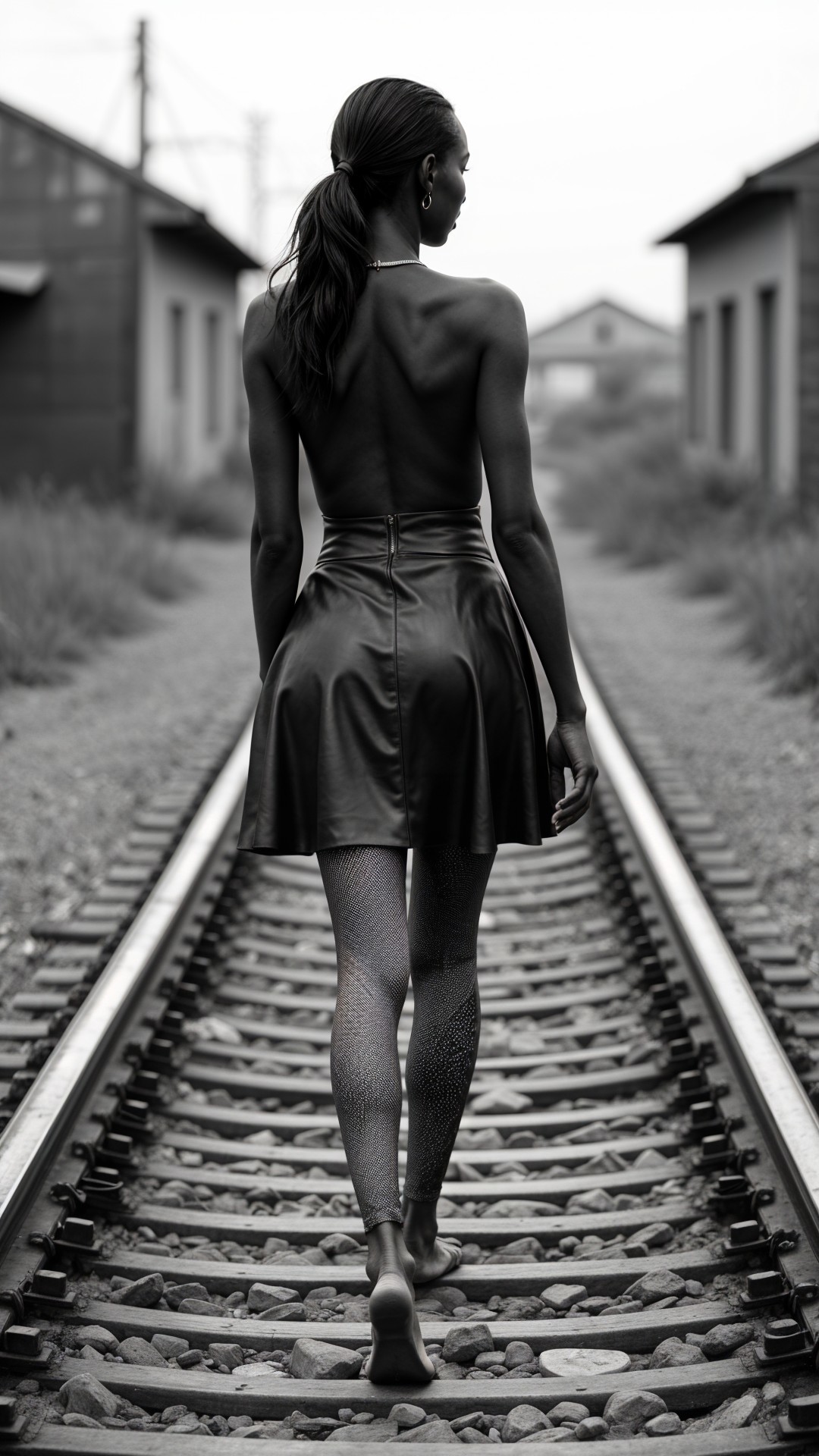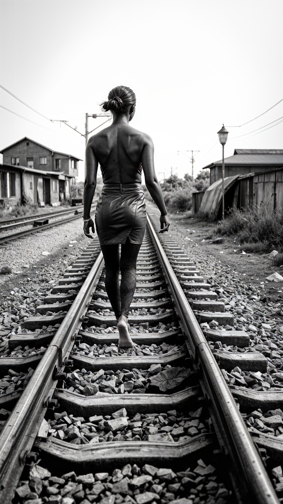Prompt: a woman in Ghana, Africa, walking barefoot along a railway track in a black-and-white composition. Her figure is framed from behind, exuding a subtle confidence and sensuality as she strides with purpose. The leather skirt and patterned tights contrast with the natural setting, blending urban sophistication with raw, grounded energy. The worn railway and surrounding rural structures suggest a journey through contrasting worlds, symbolizing resilience and independence. The monochrome palette adds a timeless, evocative quality, highlighting her silhouette and the interplay between movement, texture, and setting. A contemplative narrative of strength and allure unfolds.Exposure -0.3, Contrast +20, Highlights -15, Shadows +10, Whites -5, Blacks -5, Vibrance +10, Saturation -5, Clarity +15, Sharpening Amount 40 with Radius 1.0, Grain Amount 20 with Size 25 and Roughness 50, and Vignette Amount -10 with Midpoint 50.